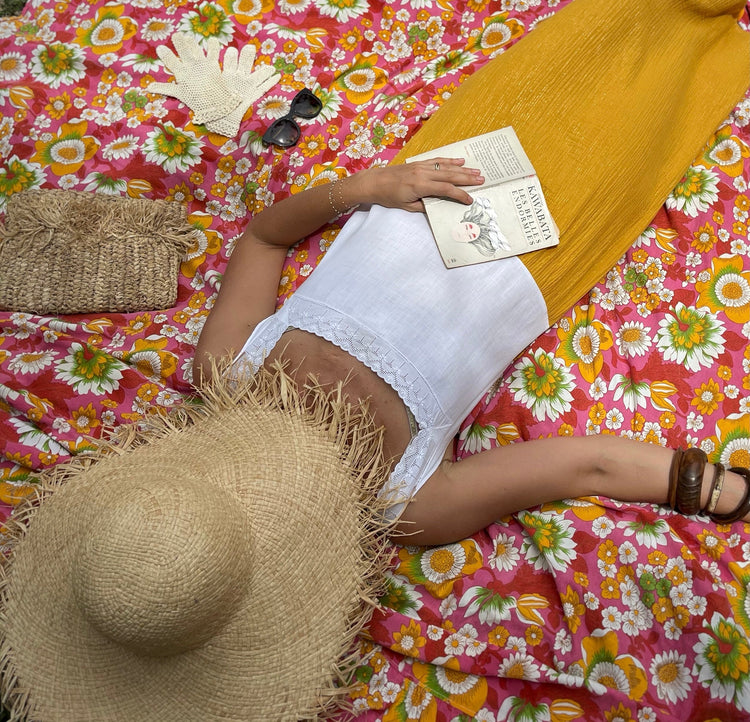 Réalisée à partir de nuisettes anciennes, brodées à la main, datant du début du XXe ou du XIXe siècle assemblées avec des saris anciens.