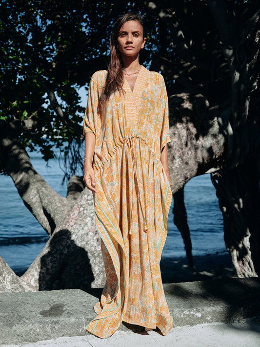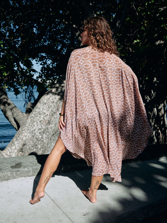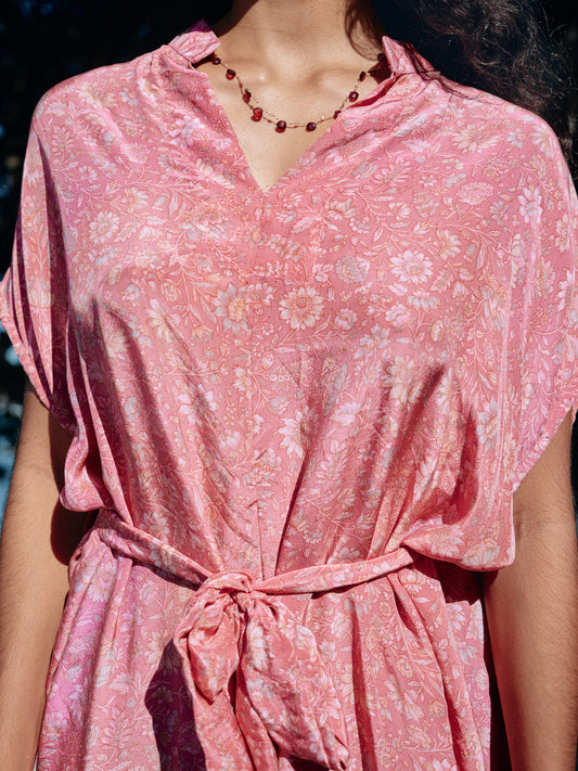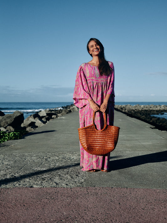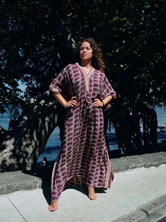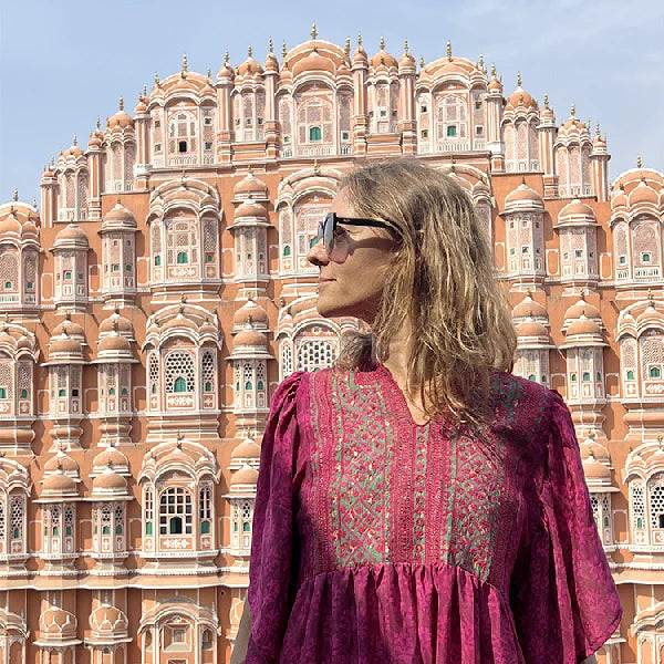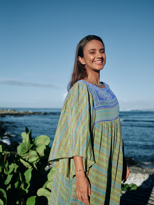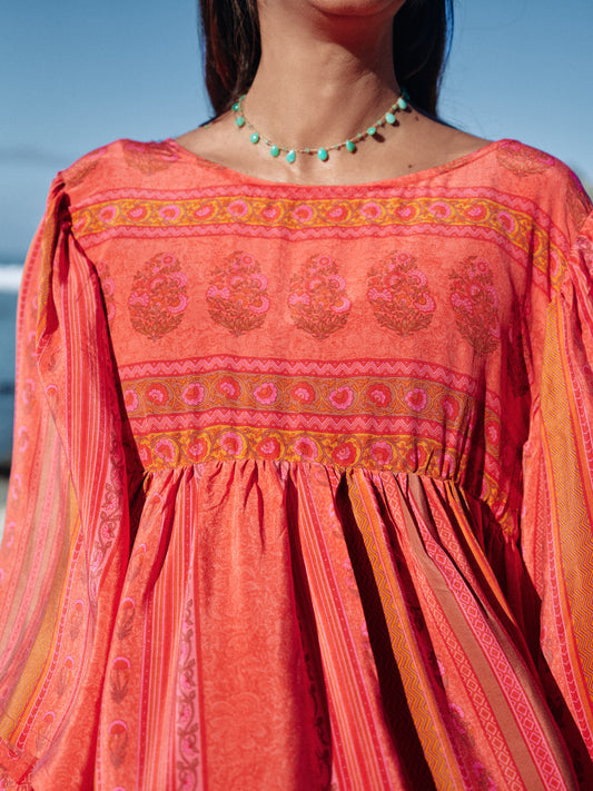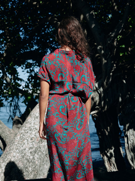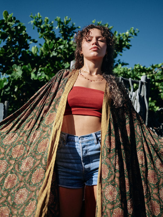 Je suis une pièce unique, j'ai été réalisée à partir d'un sari ancien à la soie naturelle exceptionnelle. J’ai une histoire pleine d’aventures sur les rives du Gange. Mes imperfections tissent les souvenirs de mon riche passé. Prenez soin de moi.