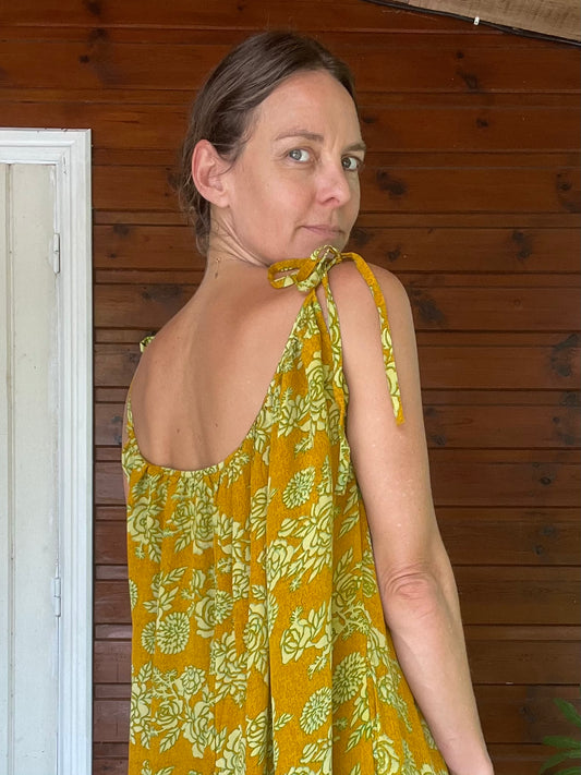Je suis une pièce unique, j'ai été réalisée à partir d'un sari ancien à la soie naturelle exceptionnelle. J’ai une histoire pleine d’aventures sur les rives du Gange. Mes imperfections tissent les souvenirs de mon riche passé. Prenez soin de moi.