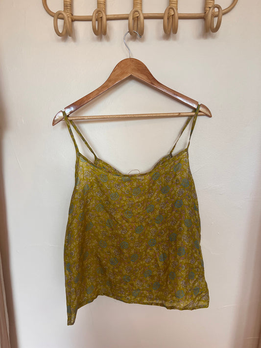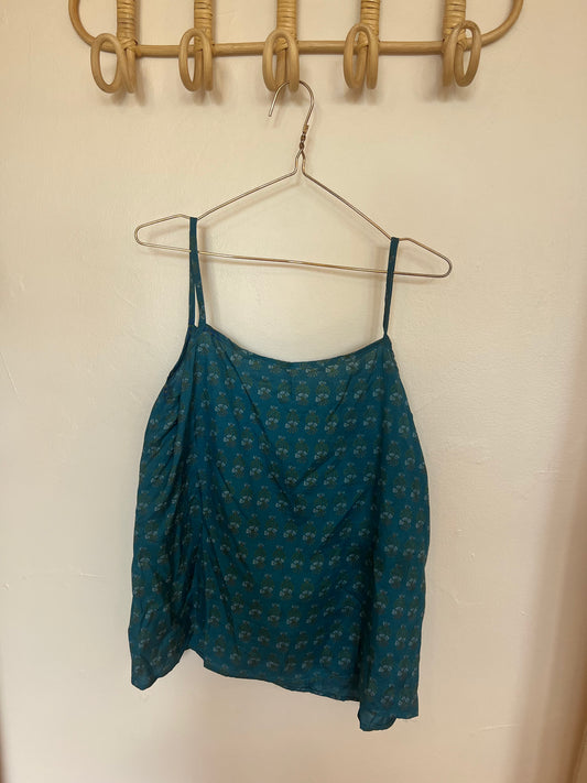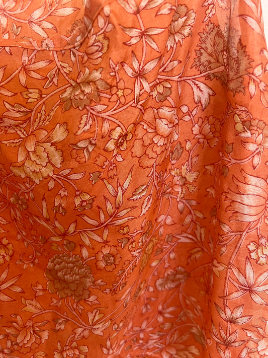 Je suis une pièce unique, j'ai été réalisée à partir d'un sari ancien à la soie naturelle exceptionnelle. J’ai une histoire pleine d’aventures sur les rives du Gange. Mes imperfections tissent les souvenirs de mon riche passé. Prenez soin de moi.