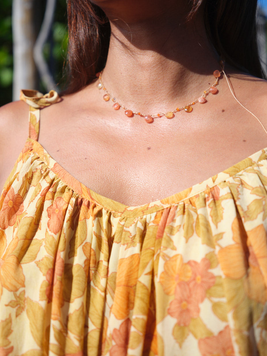Notre Collier tissé à la main avec des pierres semi-précieuses naturelles de pierres du soleil et topaze impérial taillées en forme de goutte. Vous pouvez le porter en ras de cou ou ajuster sa longueur grâce à son noeud coulissant.