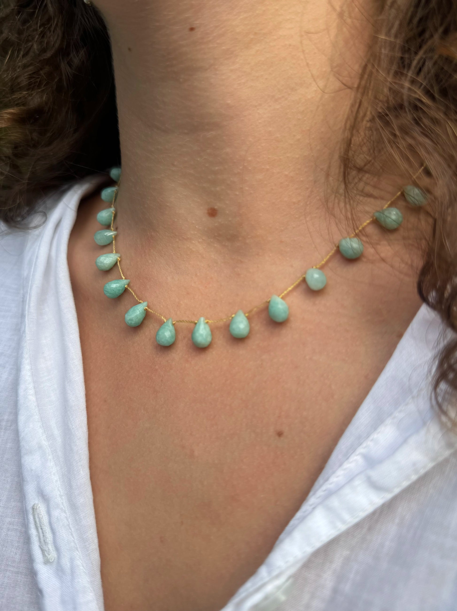 Notre Collier tissé à la main avec des pierres semi-précieuses naturelles d’amazonite taillées en forme de goutte. Vous pouvez le porter en ras de cou ou ajuster sa longueur grâce à son noeud coulissant.