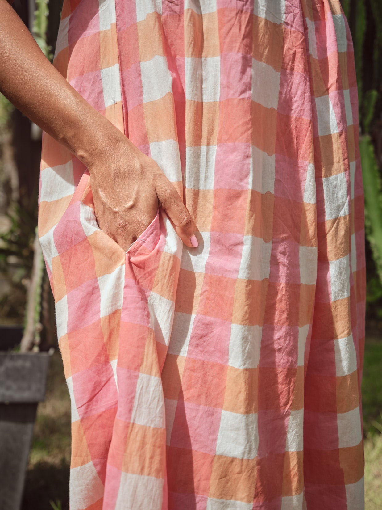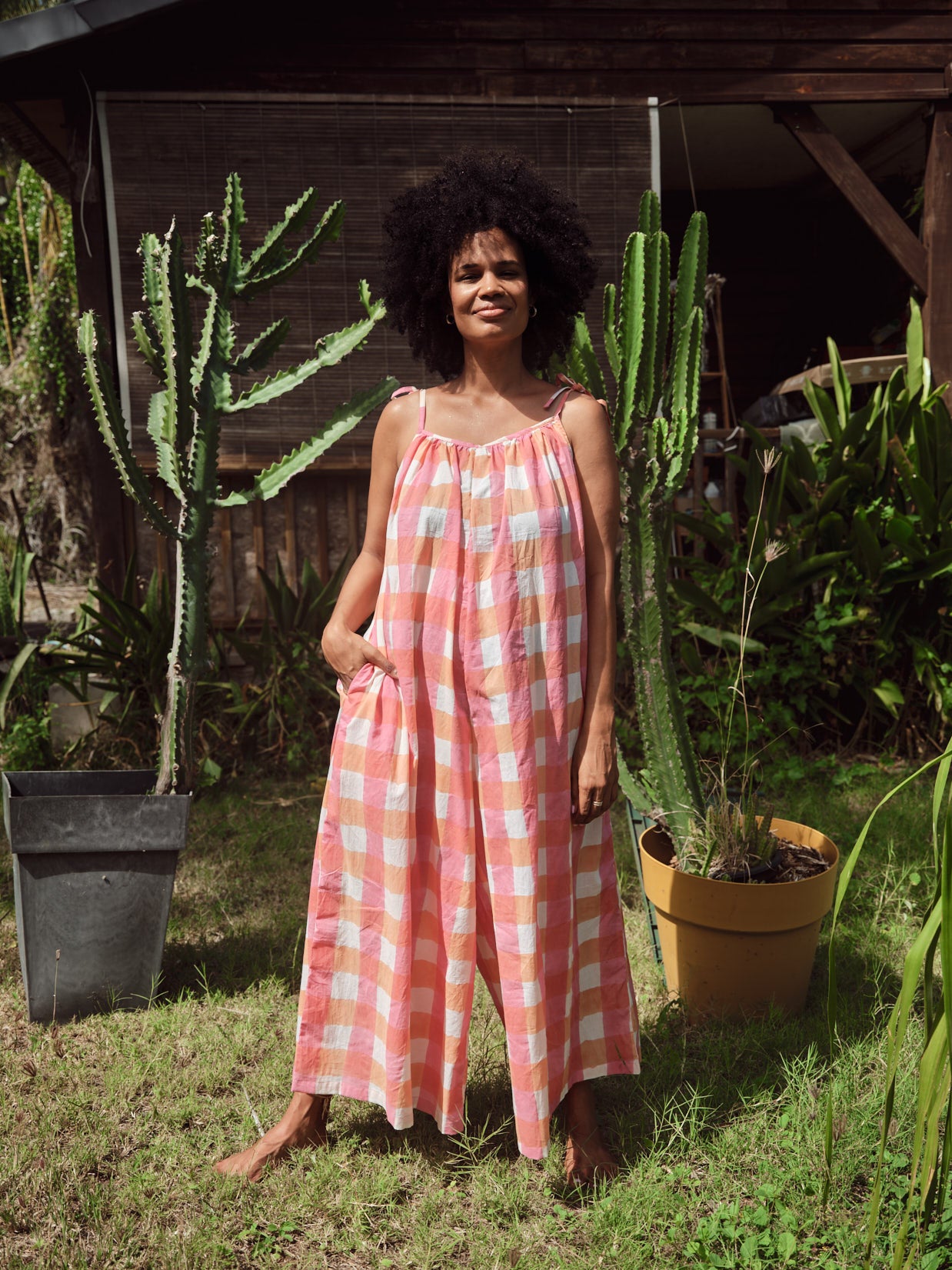 La combinaison Christophine a une coupe bohème et élégante. Elle a de fines bretelles nouables qui permettent d'ajuster la combinaison et d'approfondir les décolletés comme on le souhaite. Ici, l’imprimé a été imprimé à la main au bloc print.