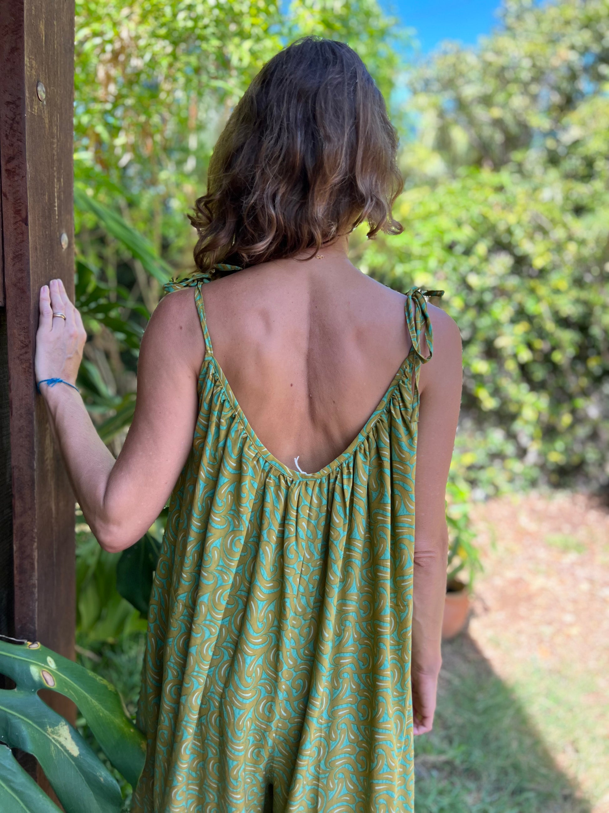 La combinaison Lakshmi a une coupe bohème et élégante. Elle a une belle échancrure au dos ainsi que de fines bretelles nouables qui permettent d'ajuster la combinaison et d'approfondir les décolletés comme on le souhaite. Cette pièce unique a été réalisée à partir d'un sari ancien.