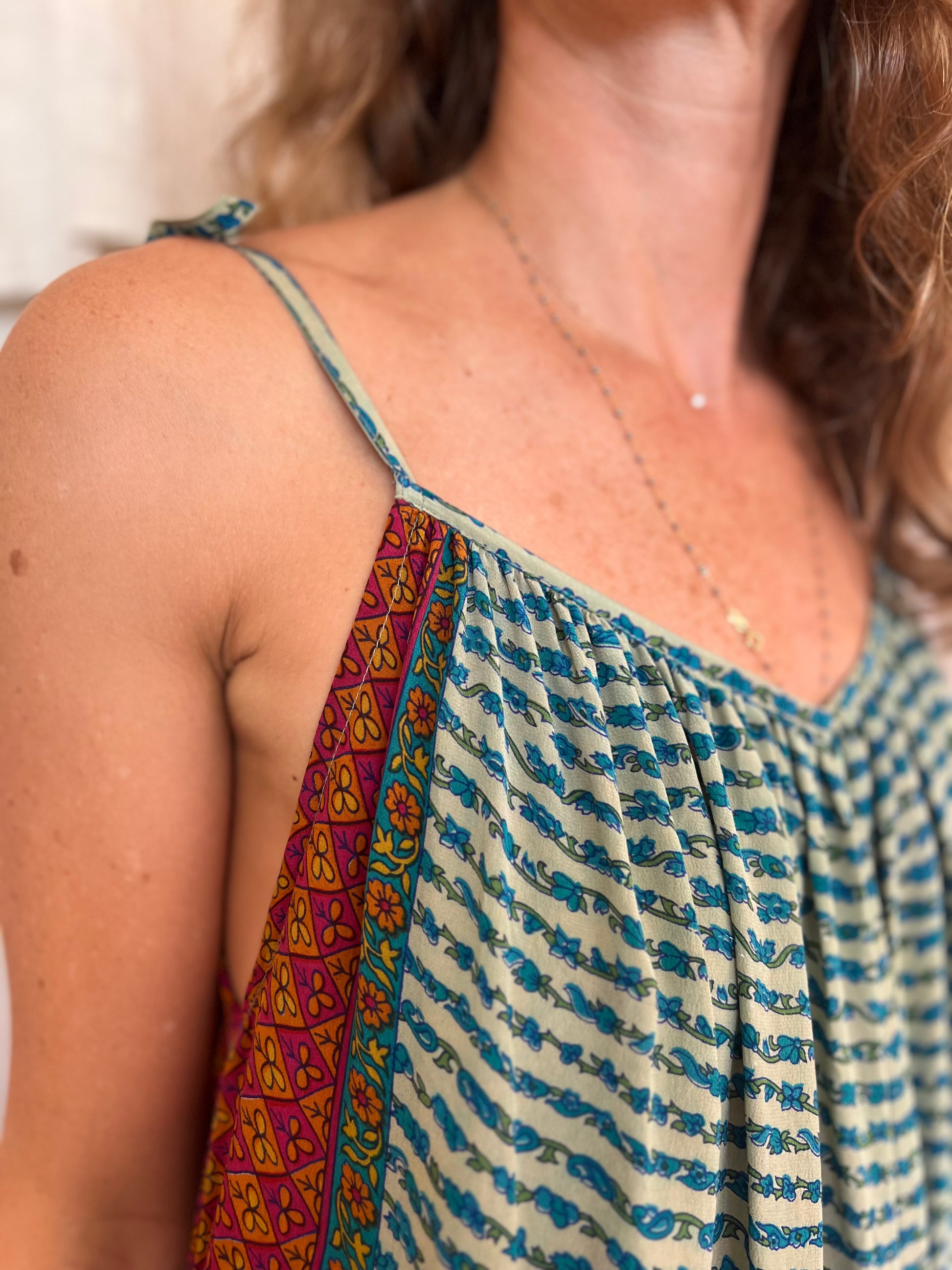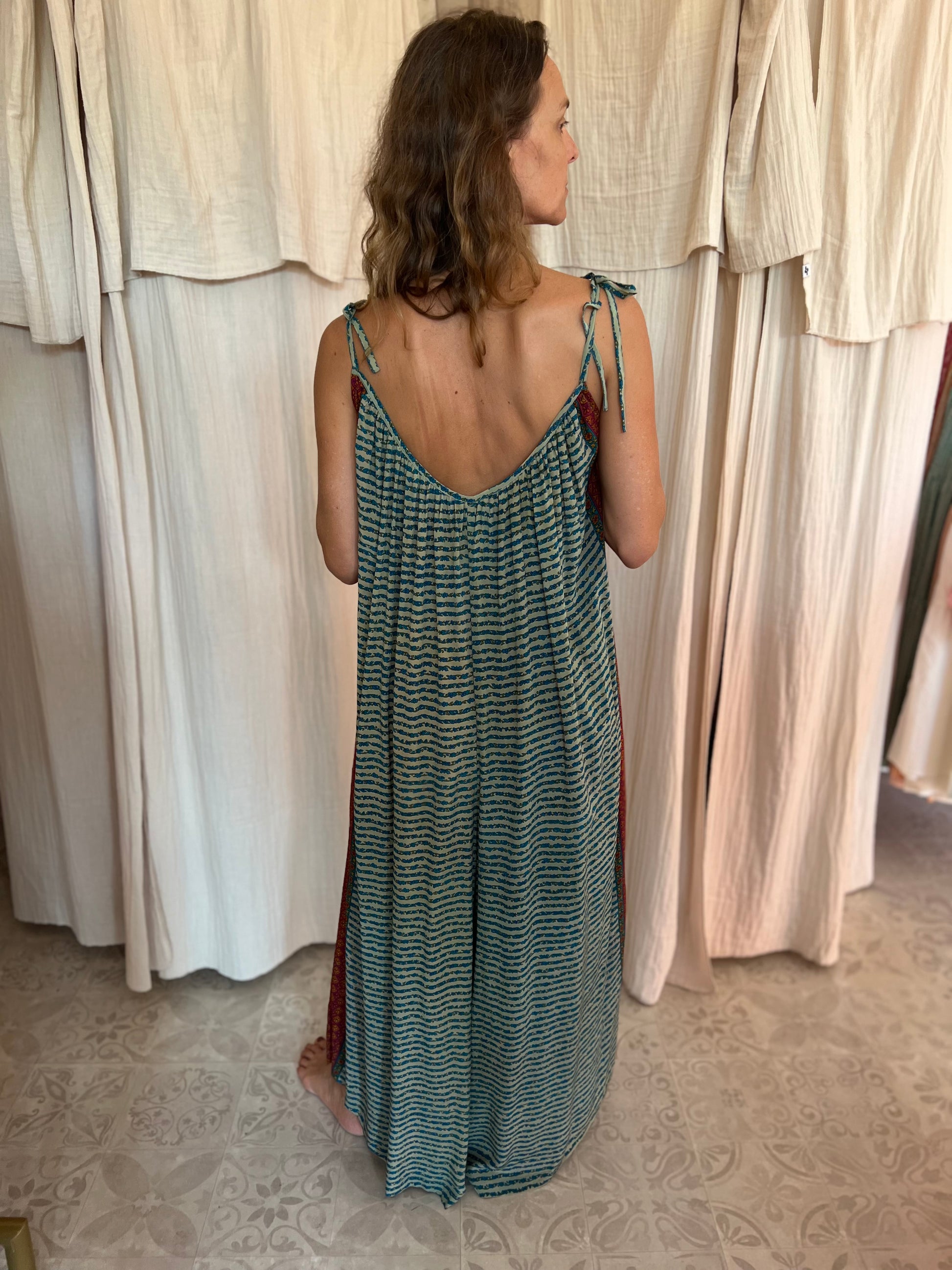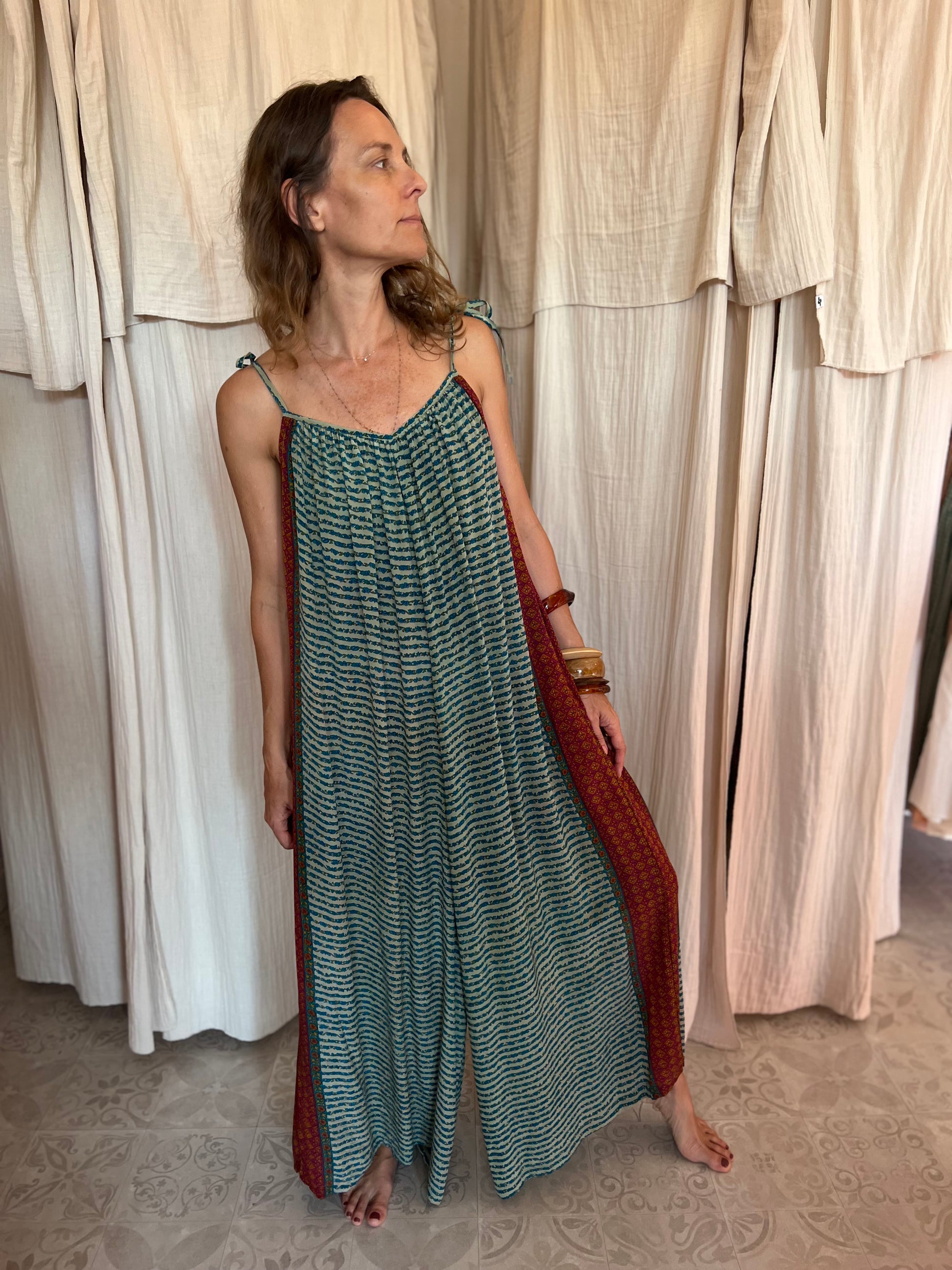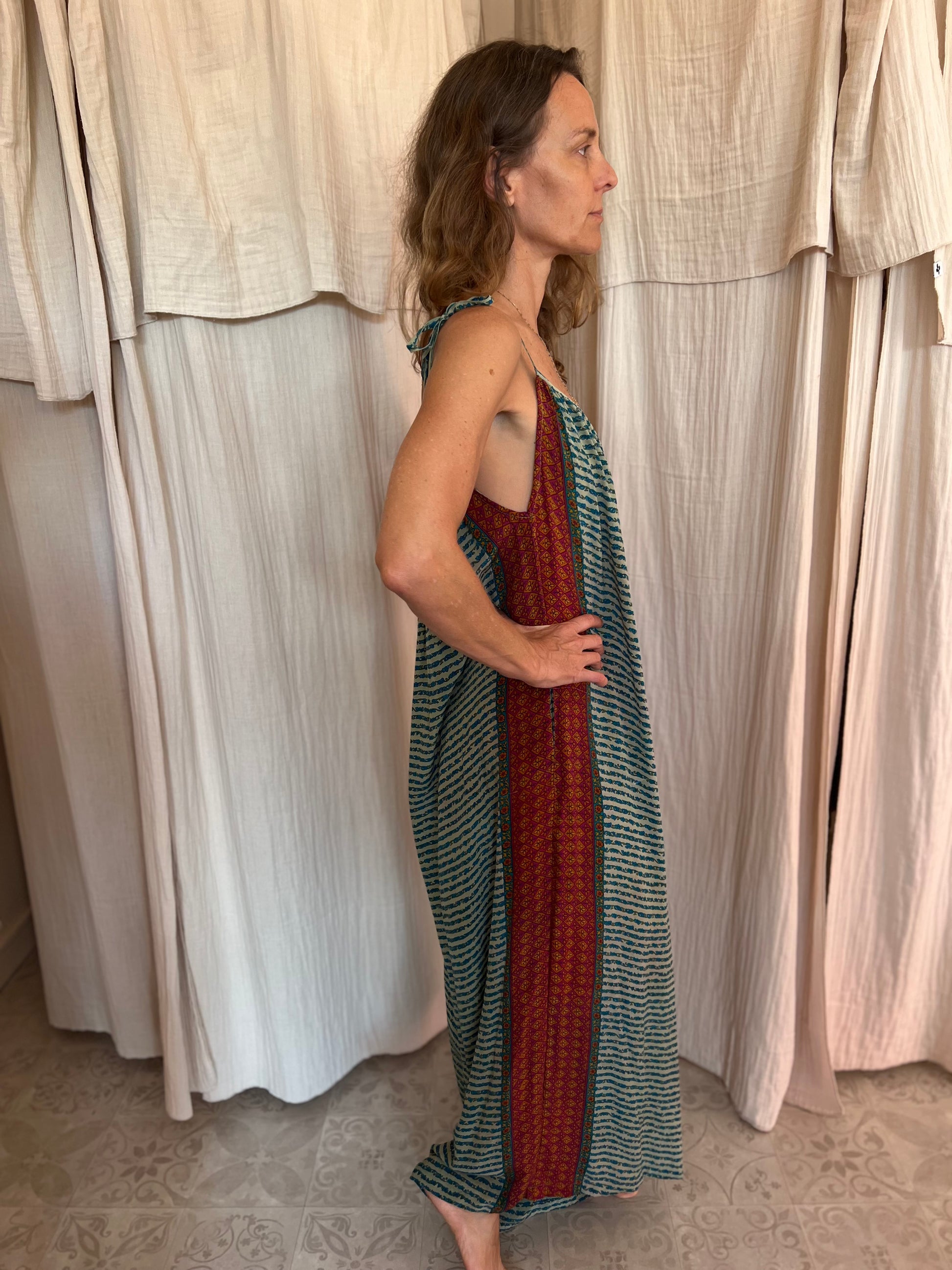 La combinaison Lakshmi a une coupe bohème et élégante. Elle a une belle échancrure au dos ainsi que de fines bretelles nouables qui permettent d'ajuster la combinaison et d'approfondir les décolletés comme on le souhaite. Cette pièce unique a été réalisée à partir d'un sari ancien.
