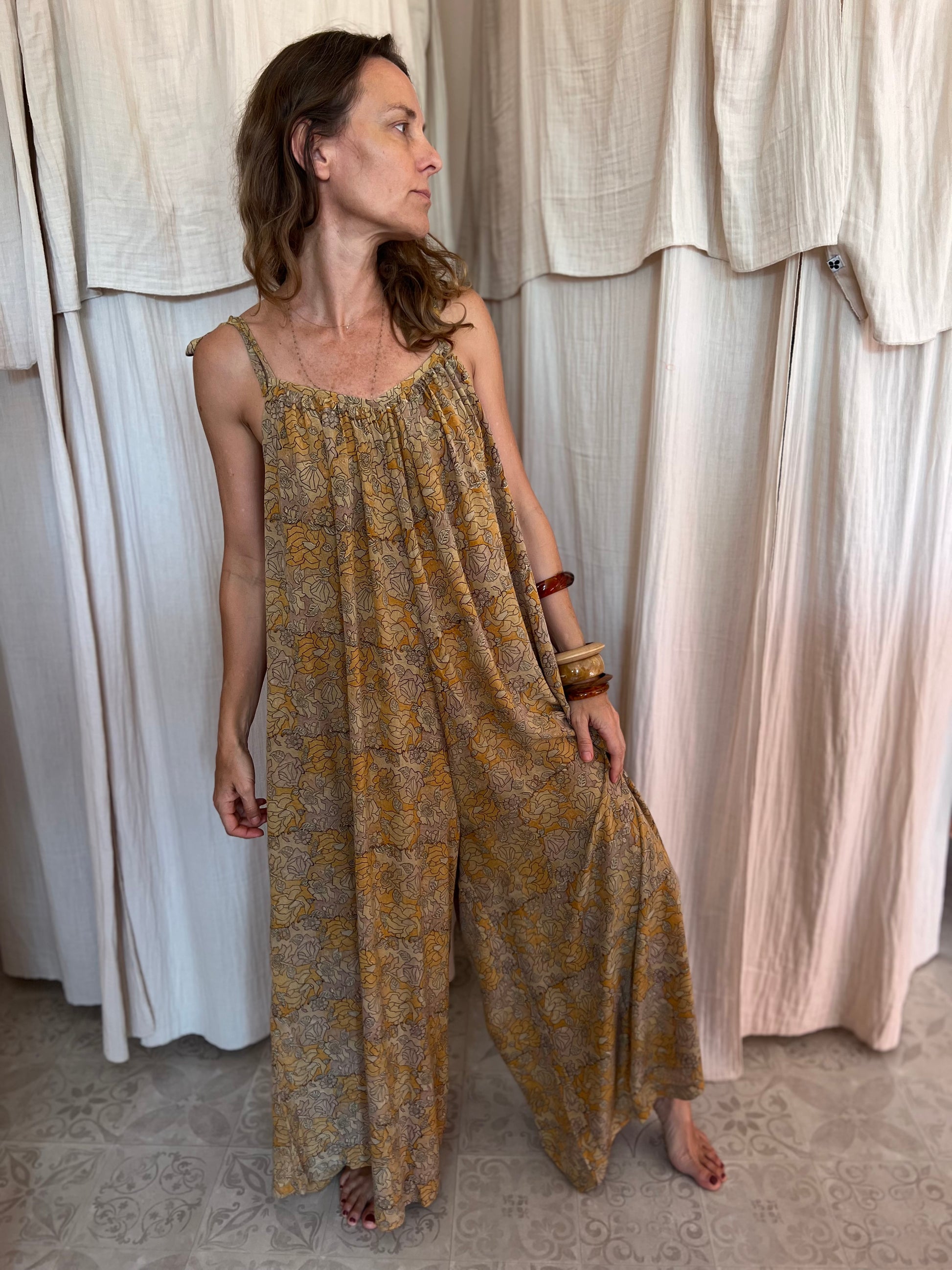 La combinaison Lakshmi a une coupe bohème et élégante. Elle a une belle échancrure au dos ainsi que de fines bretelles nouables qui permettent d'ajuster la combinaison et d'approfondir les décolletés comme on le souhaite. Cette pièce unique a été réalisée à partir d'un sari ancien.