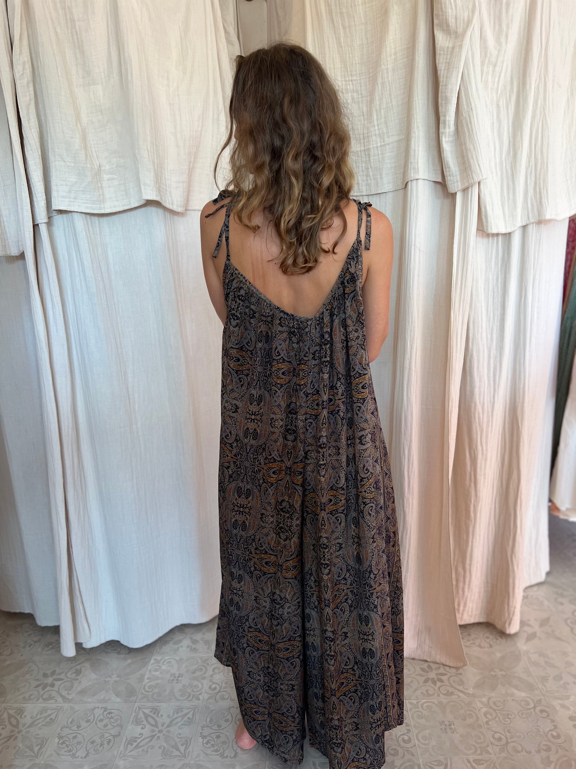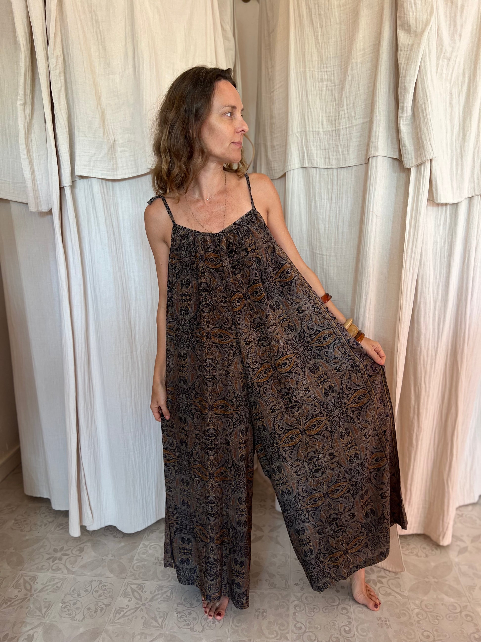 La combinaison Lakshmi a une coupe bohème et élégante. Elle a une belle échancrure au dos ainsi que de fines bretelles nouables qui permettent d'ajuster la combinaison et d'approfondir les décolletés comme on le souhaite. Cette pièce unique a été réalisée à partir d'un sari ancien.