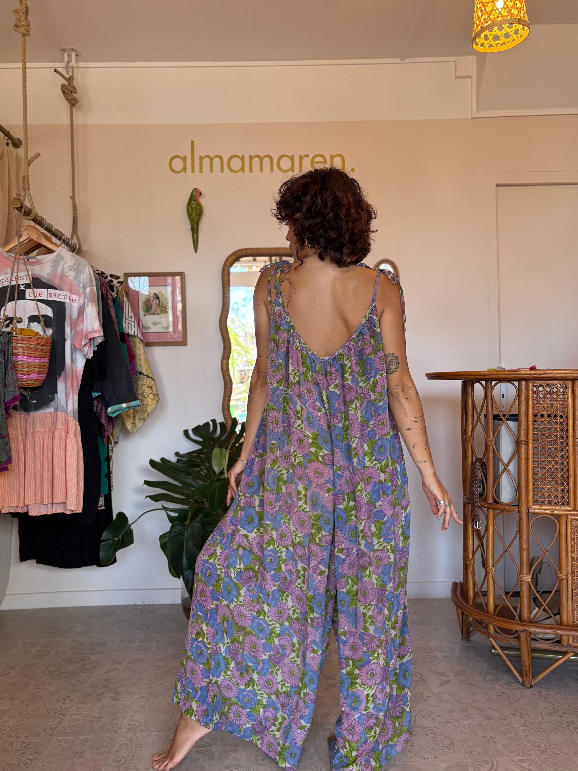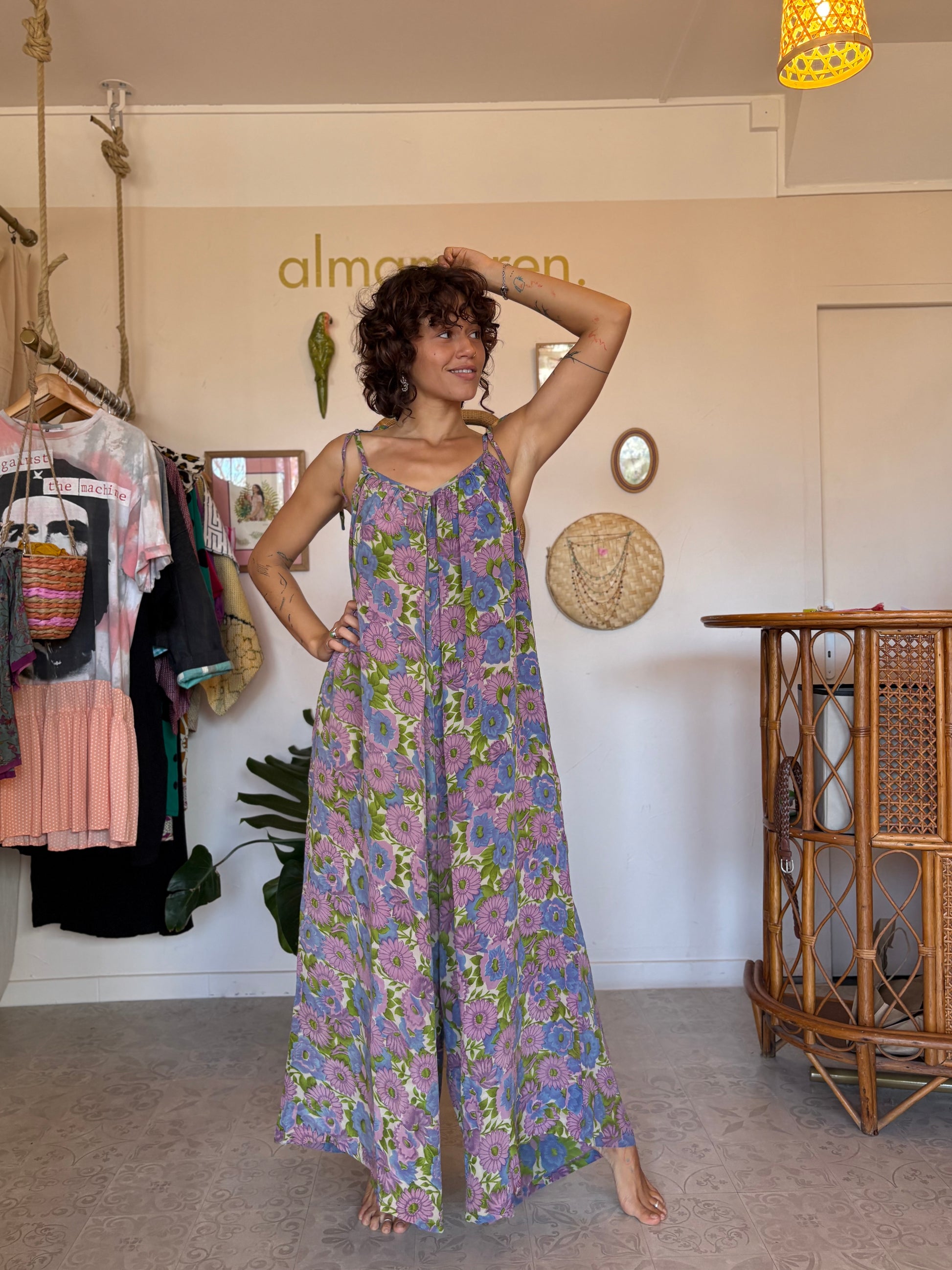 La combinaison Lakshmi a une coupe bohème et élégante. Elle a une belle échancrure au dos ainsi que de fines bretelles nouables qui permettent d'ajuster la combinaison et d'approfondir les décolletés comme on le souhaite. Cette pièce unique a été réalisée à partir d'un sari ancien.