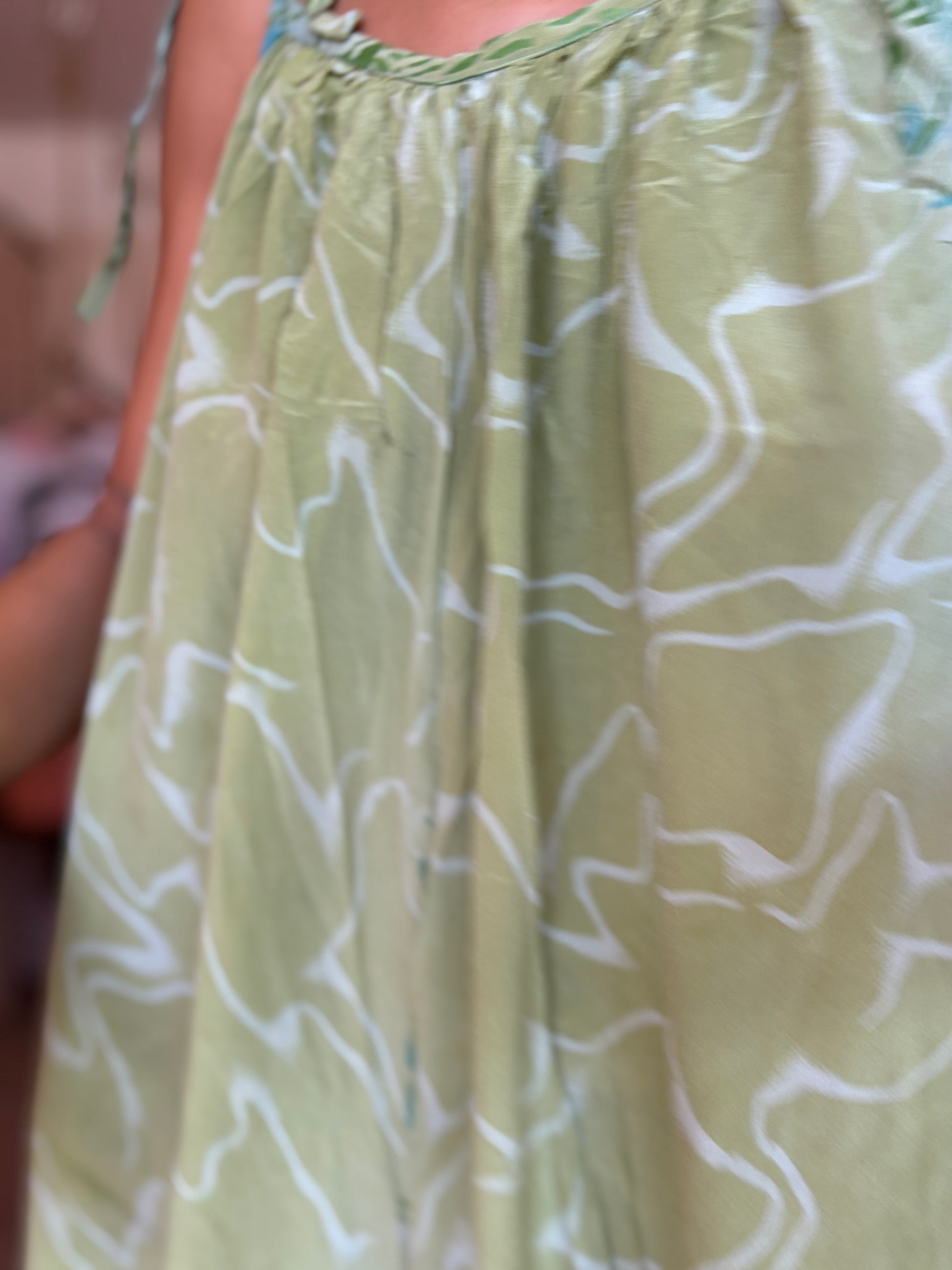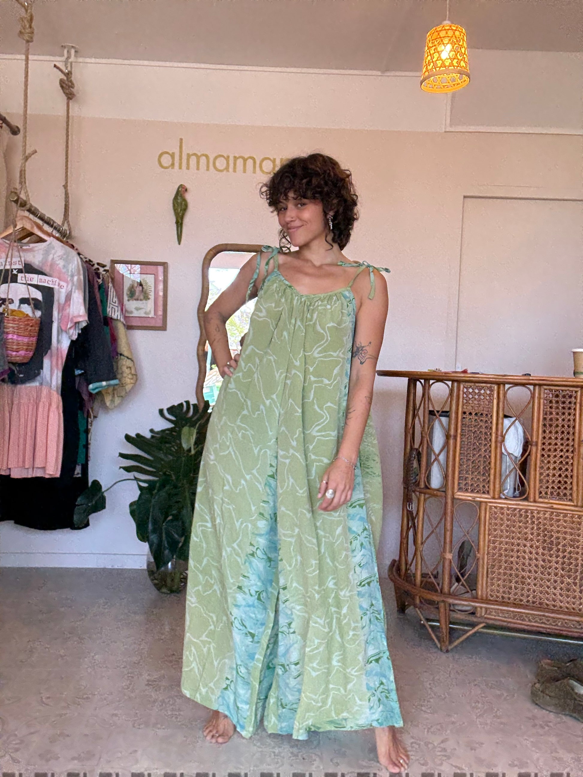La combinaison Lakshmi a une coupe bohème et élégante. Elle a une belle échancrure au dos ainsi que de fines bretelles nouables qui permettent d'ajuster la combinaison et d'approfondir les décolletés comme on le souhaite. Cette pièce unique a été réalisée à partir d'un sari ancien.