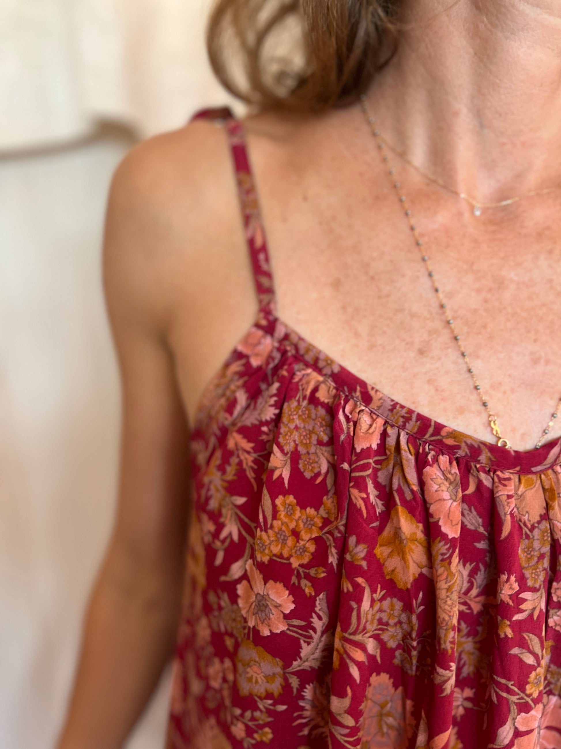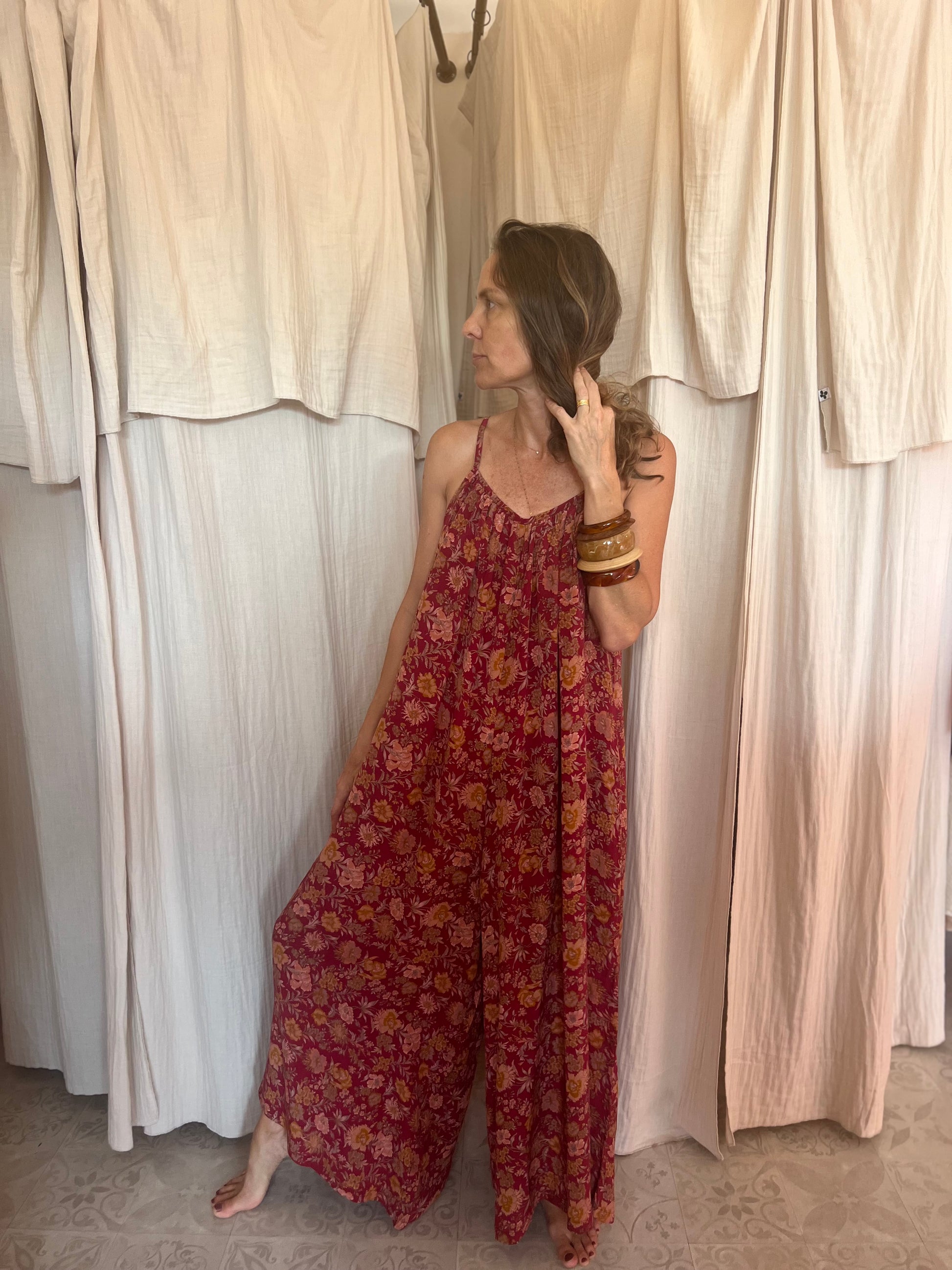La combinaison Lakshmi a une coupe bohème et élégante. Elle a une belle échancrure au dos ainsi que de fines bretelles nouables qui permettent d'ajuster la combinaison et d'approfondir les décolletés comme on le souhaite. Cette pièce unique a été réalisée à partir d'un sari ancien.