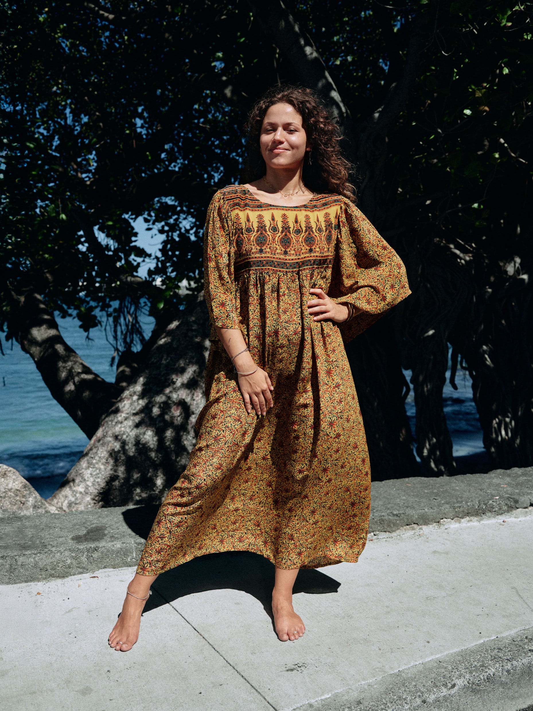 Notre Robe Akansha a un style bohème. Elle a été conçue à partir d'un sari ancien en crèpe de soie naturelle. Cette pièce unique offre une silhouette longue et fluide.