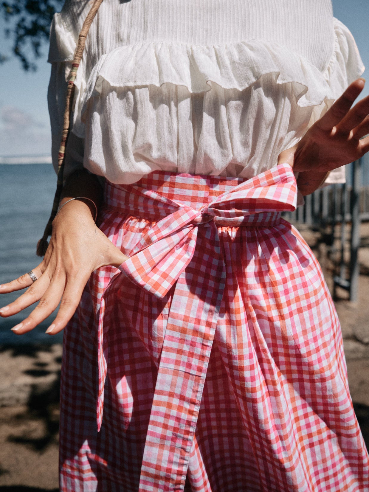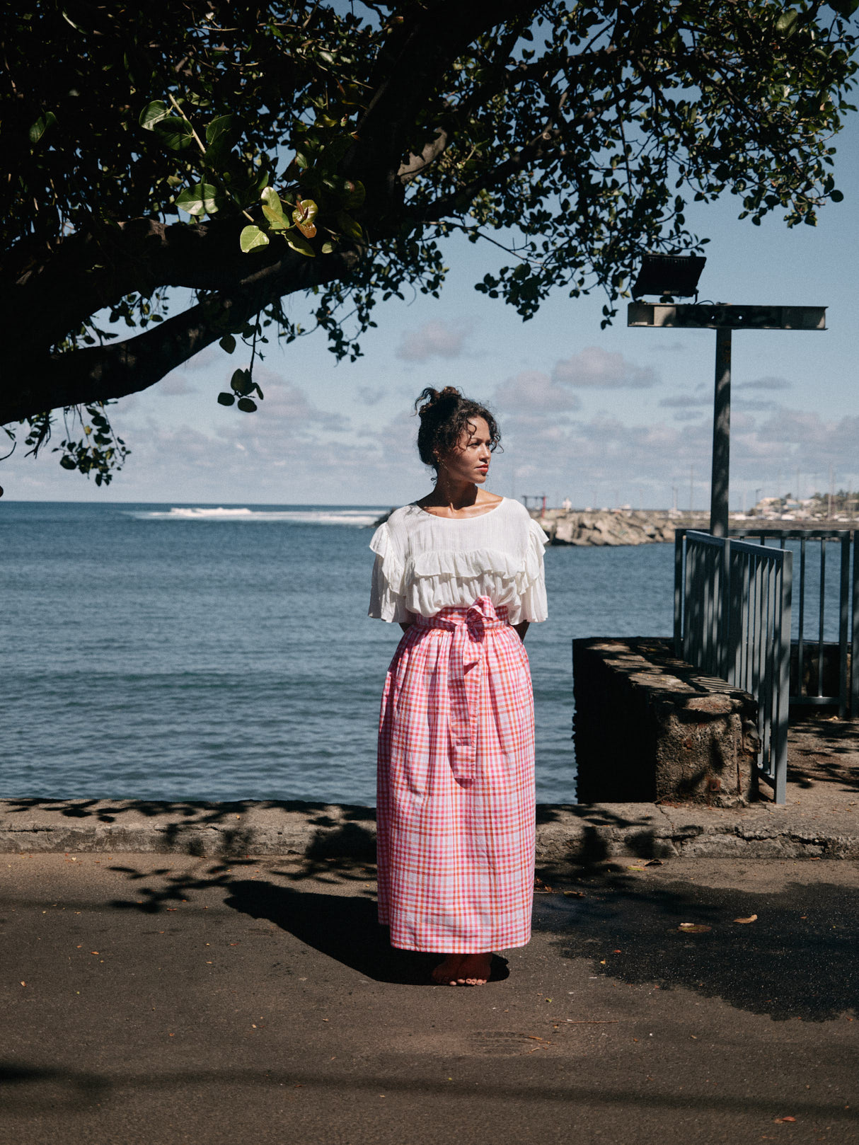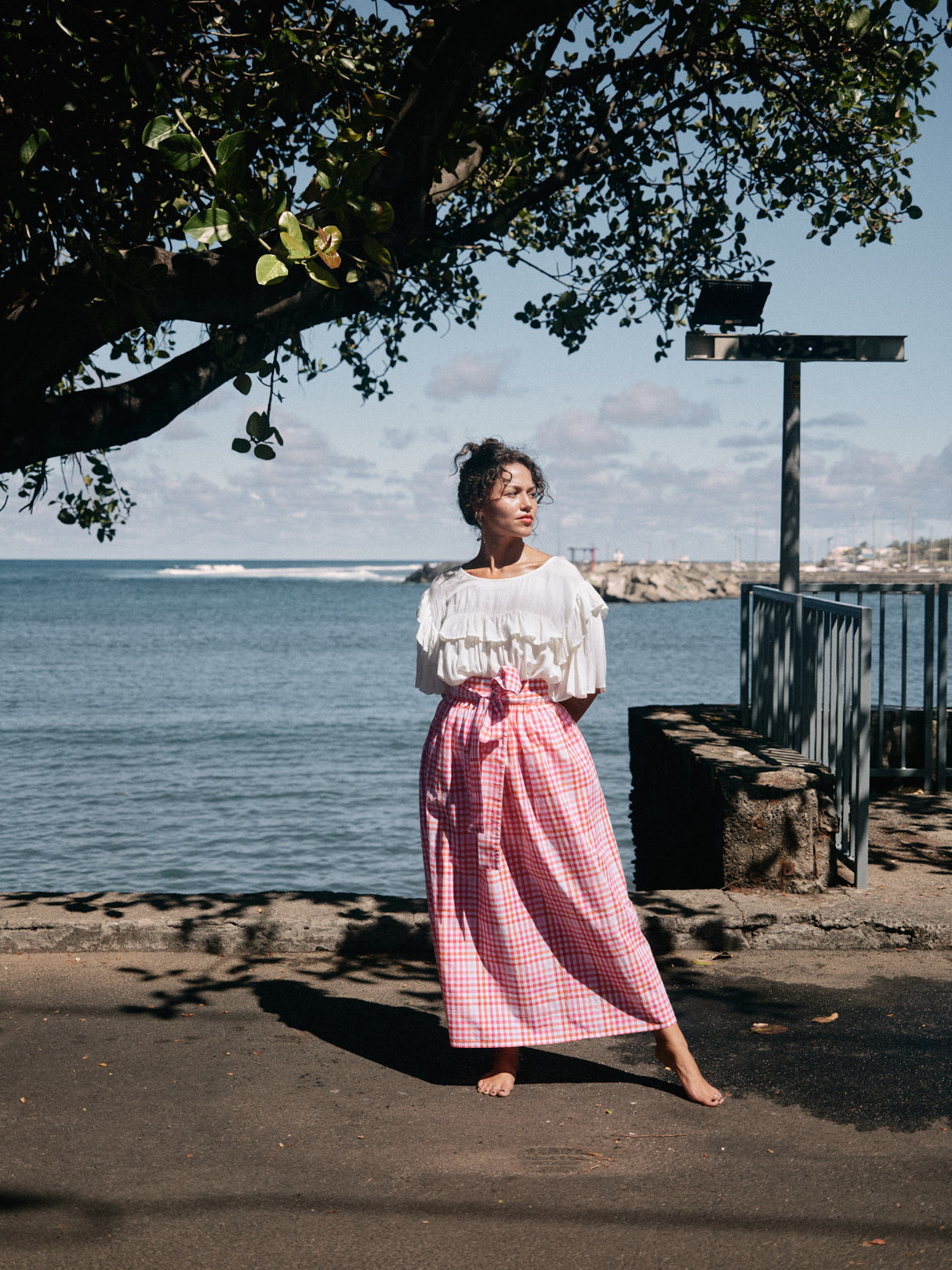 La jupe Bagatelle est une jupe qui se porte taille haute ou moyenne. Pour une taille de 1m70, une longueur 7/8ème. Belle amplitude.