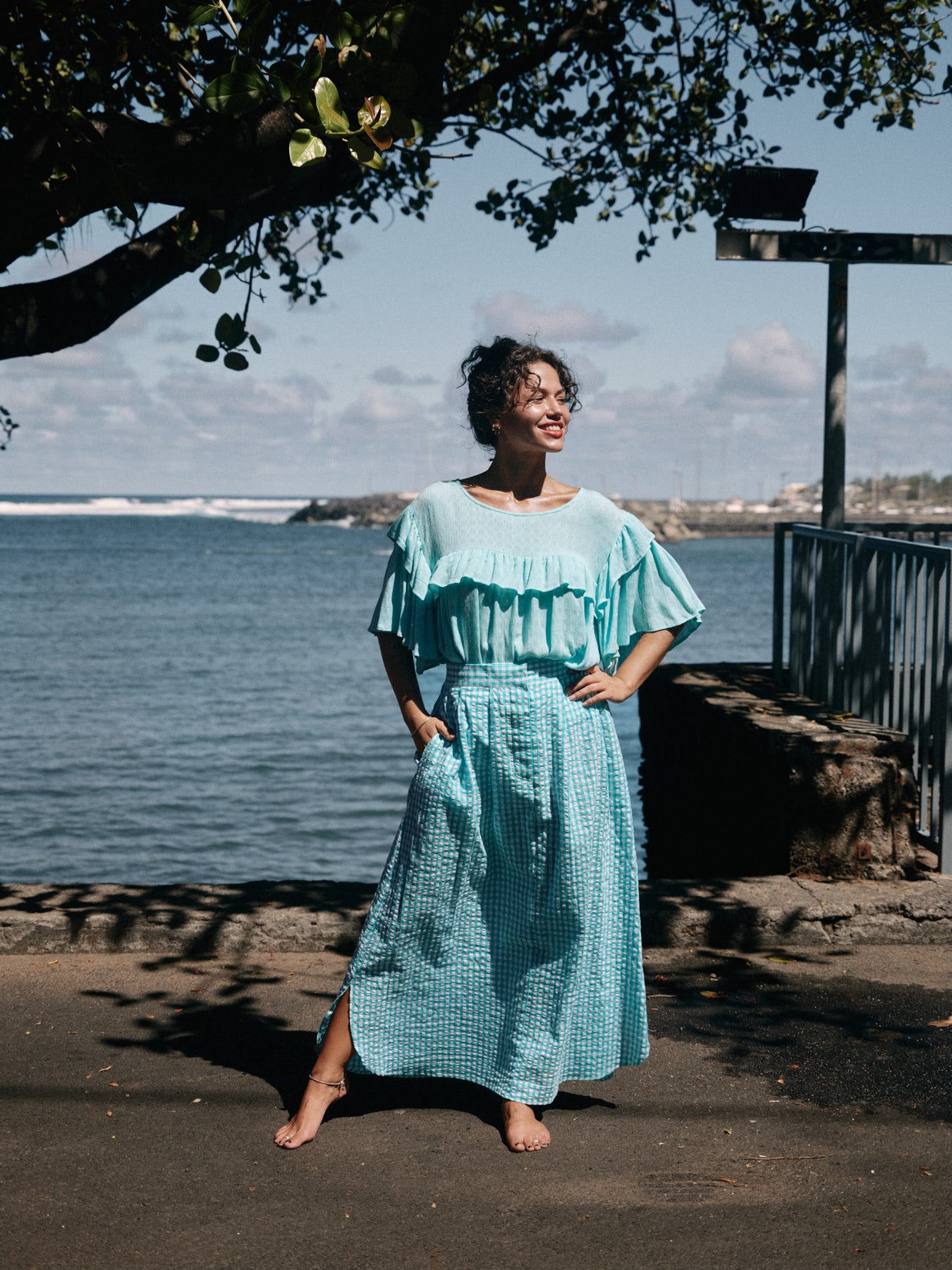 Découvrez notre jupe Caro, une jupe à la coupe street et confortable. Dôtée d'une boutonnière à l'avant et d'un ourlet arrondi dans le bas, cette jupe présente des détails raffinés qui lui confèrent un style élégant et féminin. Ses 4 plis sous la ceinture créent un joli volume.