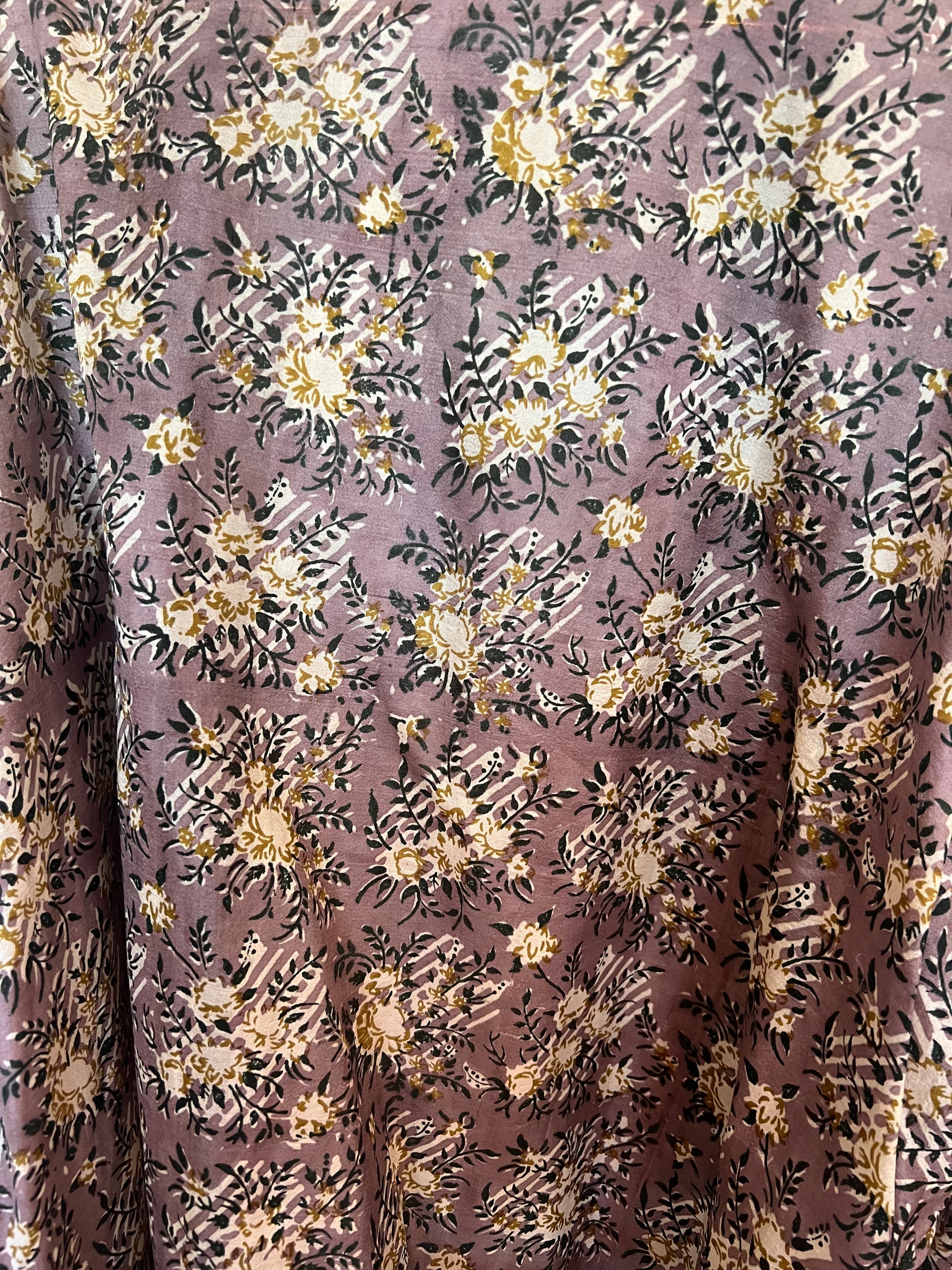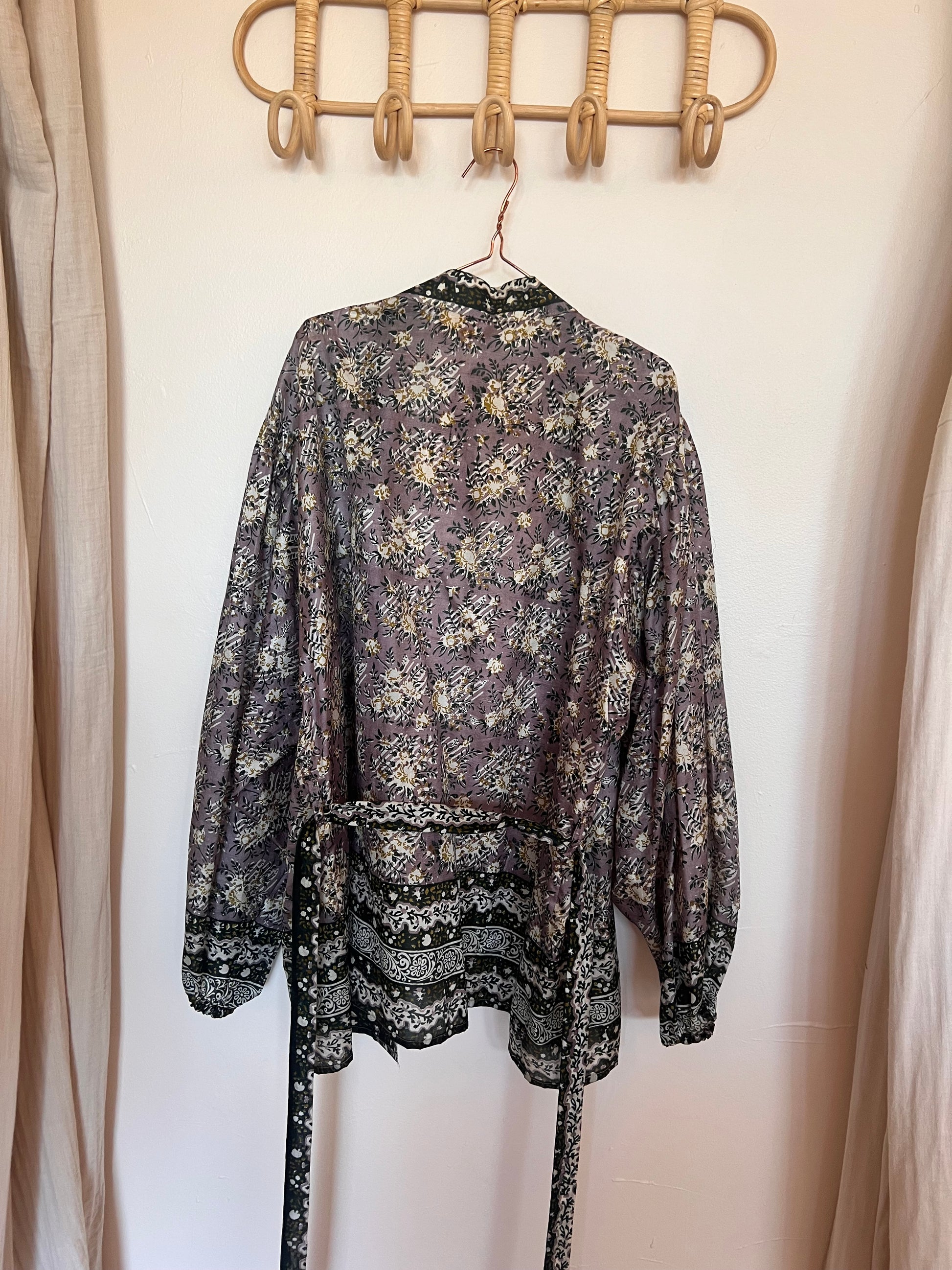 Kimono en soie 100% naturelle issue d’un sari ancien. Grandes manches bouffantes et élastique à l’avant bras.