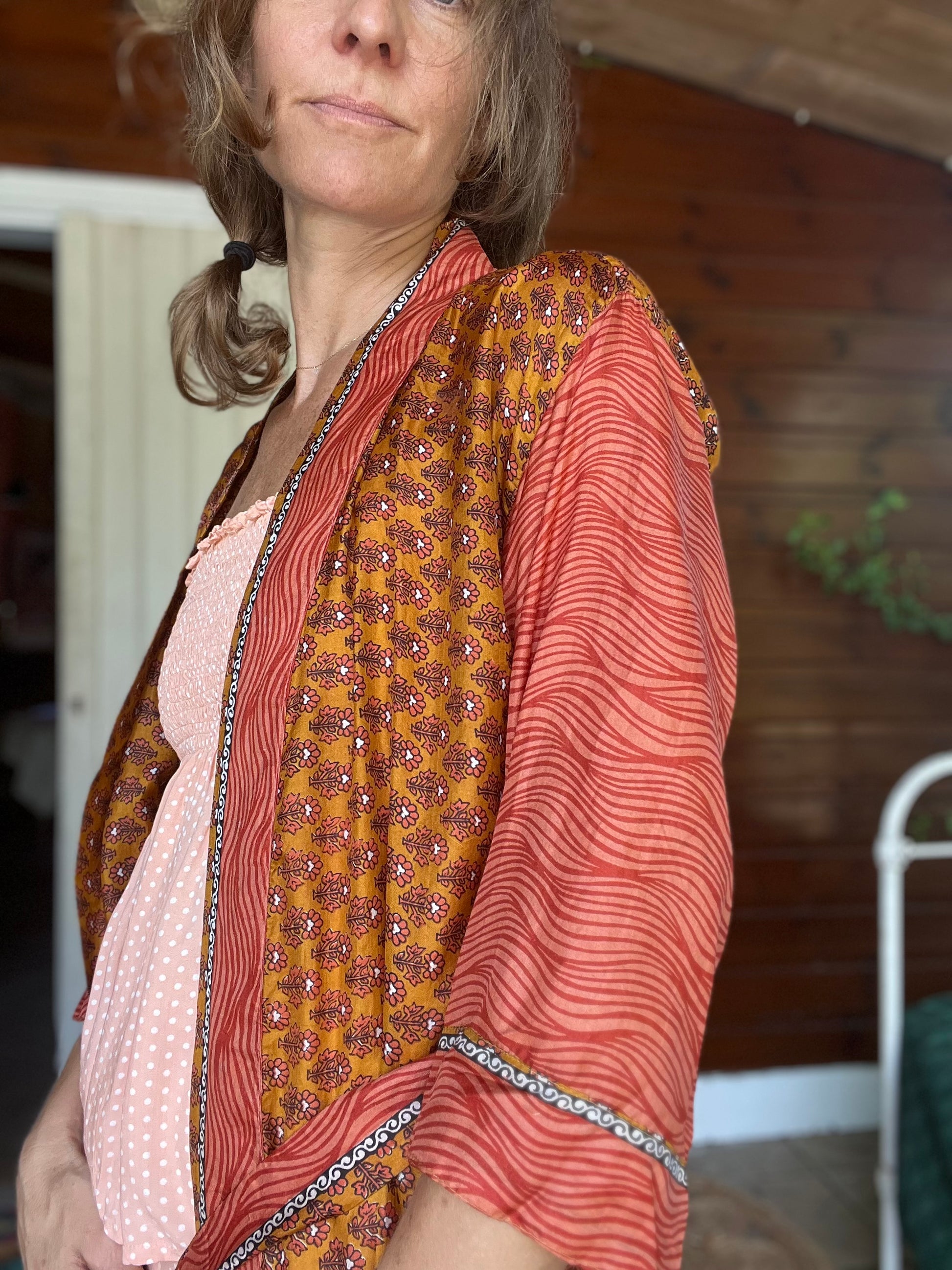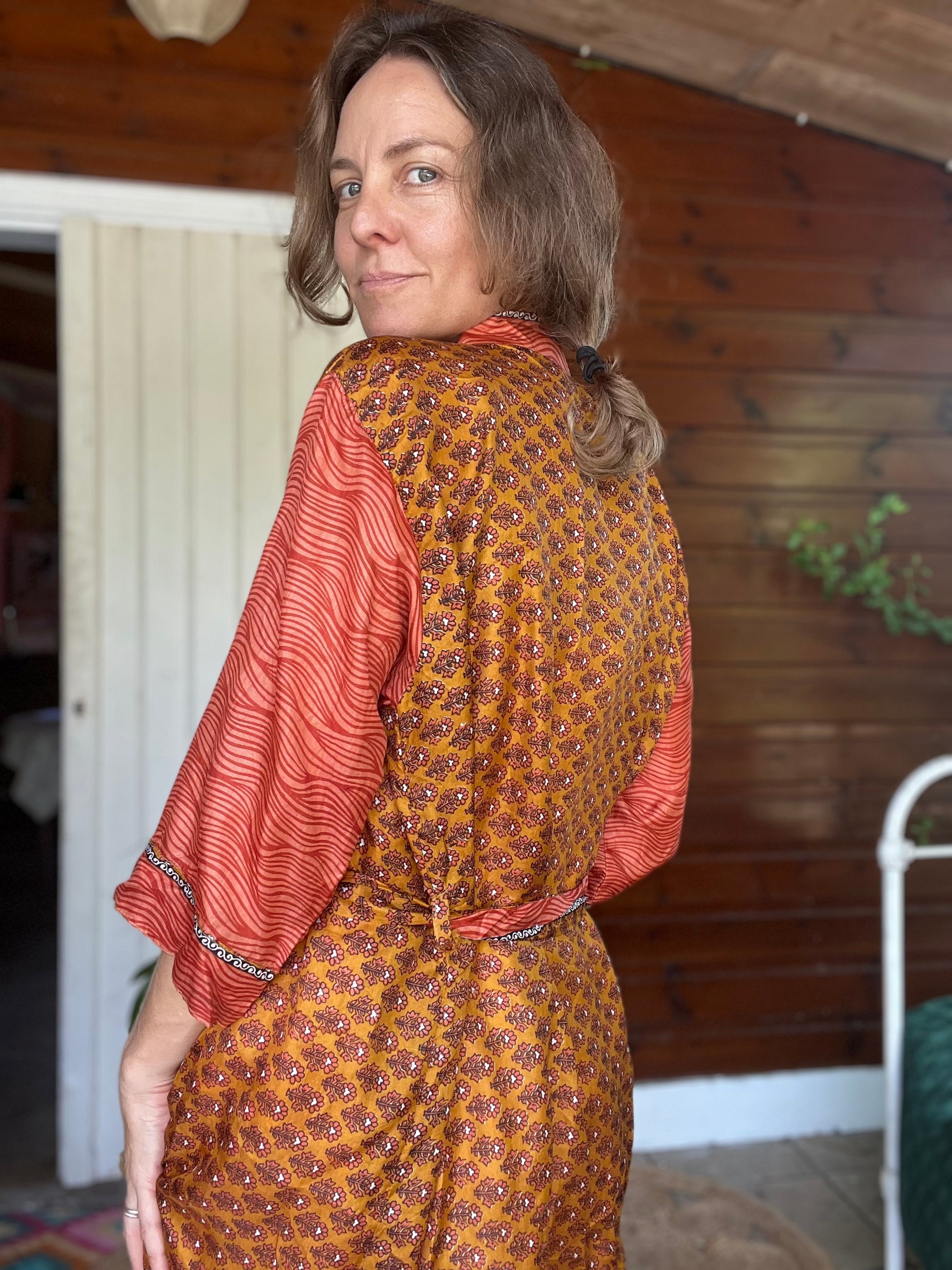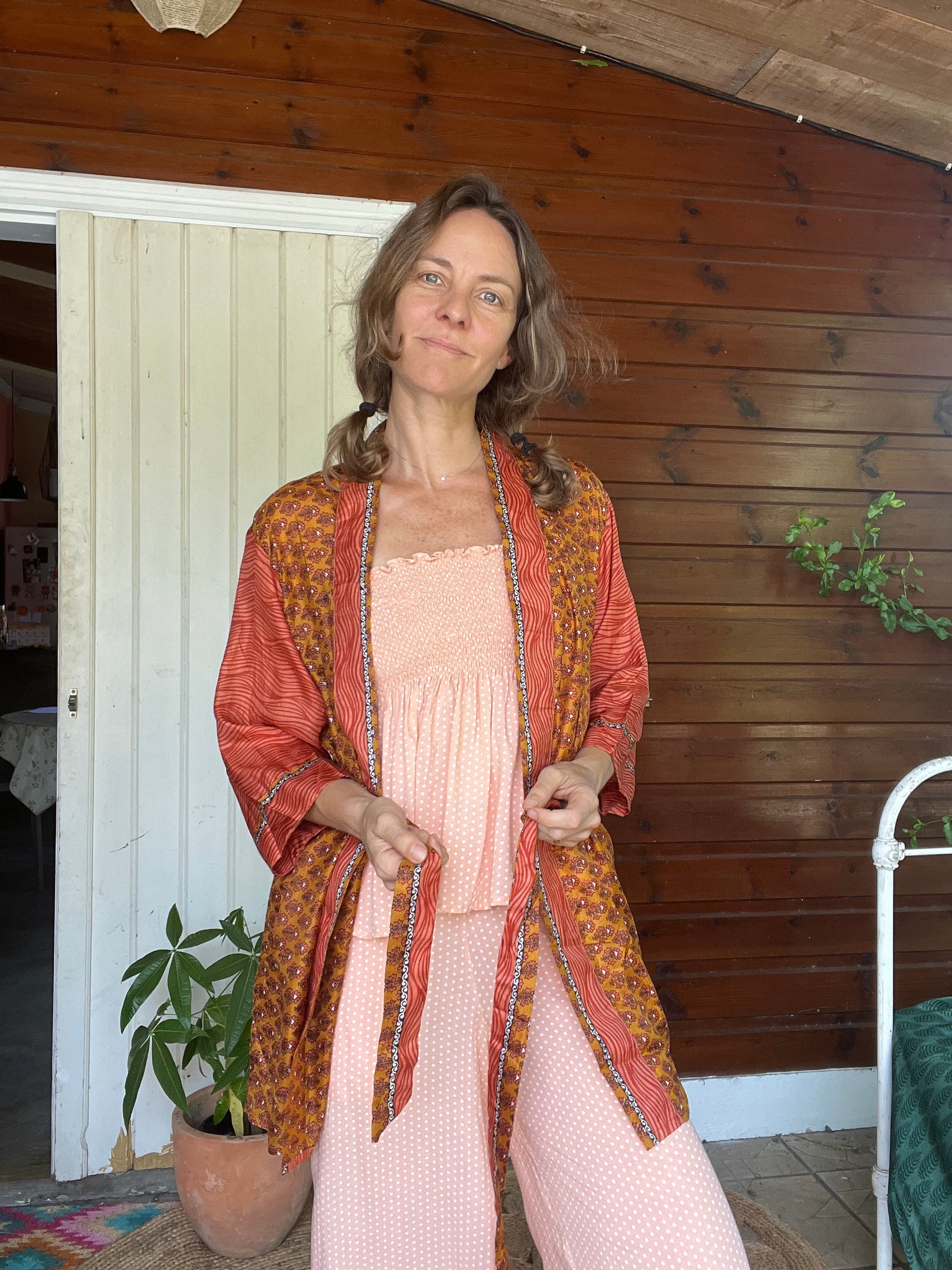 Le Kimono Mala court, une pièce bohème chic qui incarne l'élégance et le décontracté. Cette pièce est unique et est fabriquée à partir d'un sari ancien en soie naturelle. Disponible en différents coloris et motifs à retrouver sur notre site.