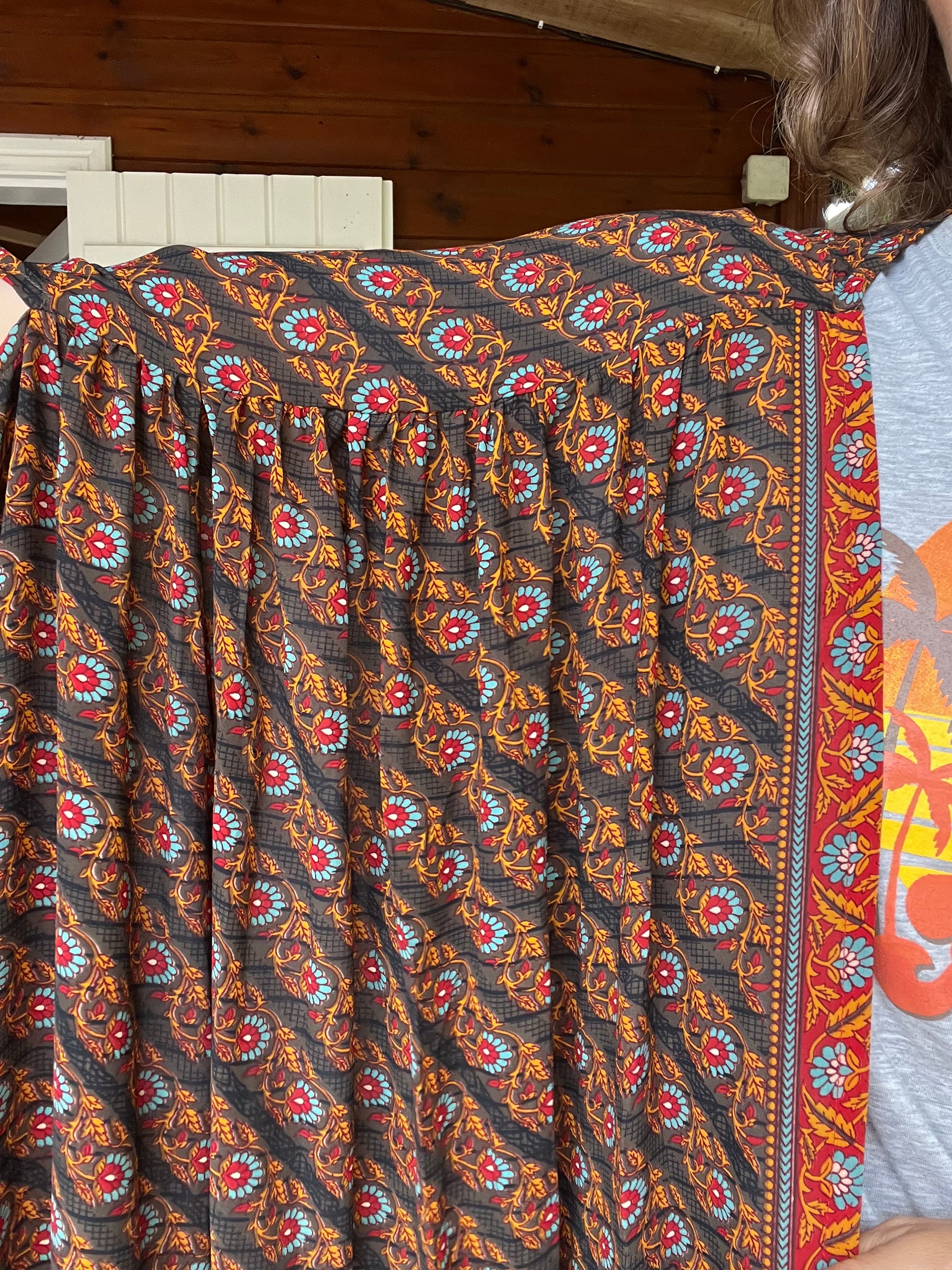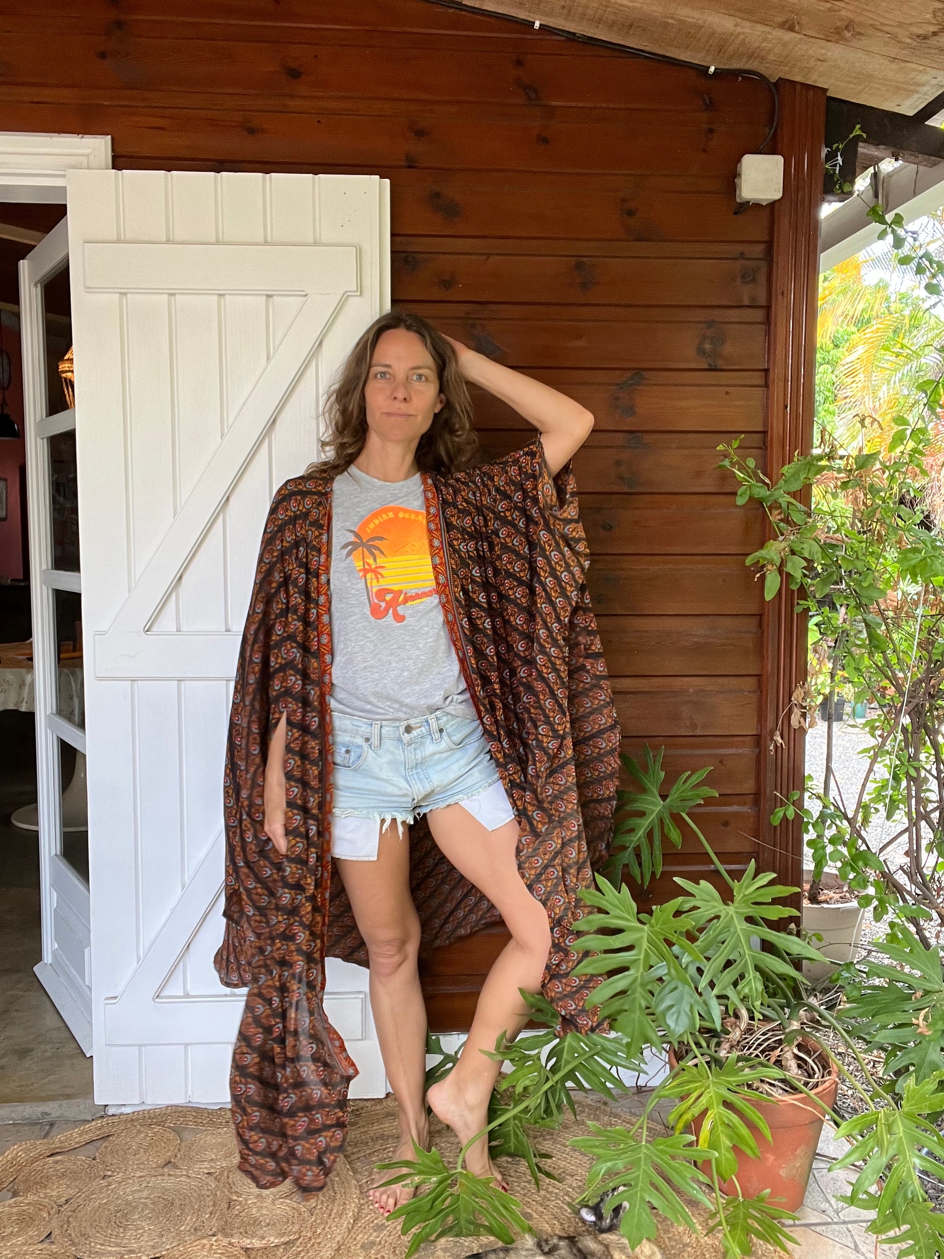 Le Kimono Meekha, une pièce bohème chic qui incarne l'élégance et le décontracté. Notre best seller est disponible en différents coloris et motifs à retrouver sur notre site. Cette pièce est unique et est fabriquée à partir d'un sari ancien en soie naturelle.
