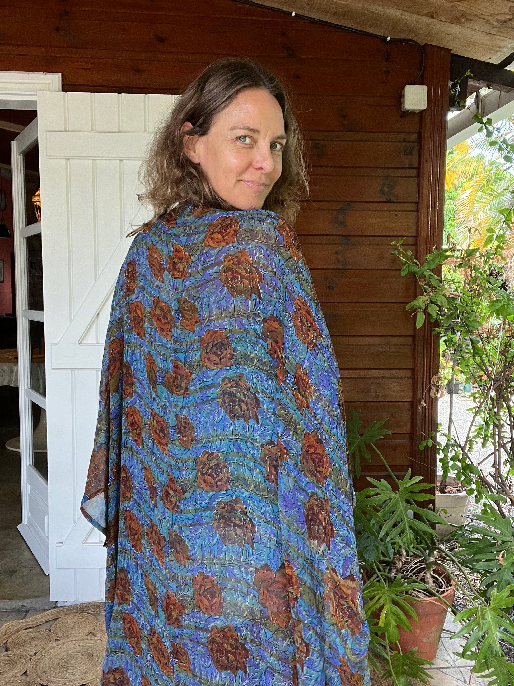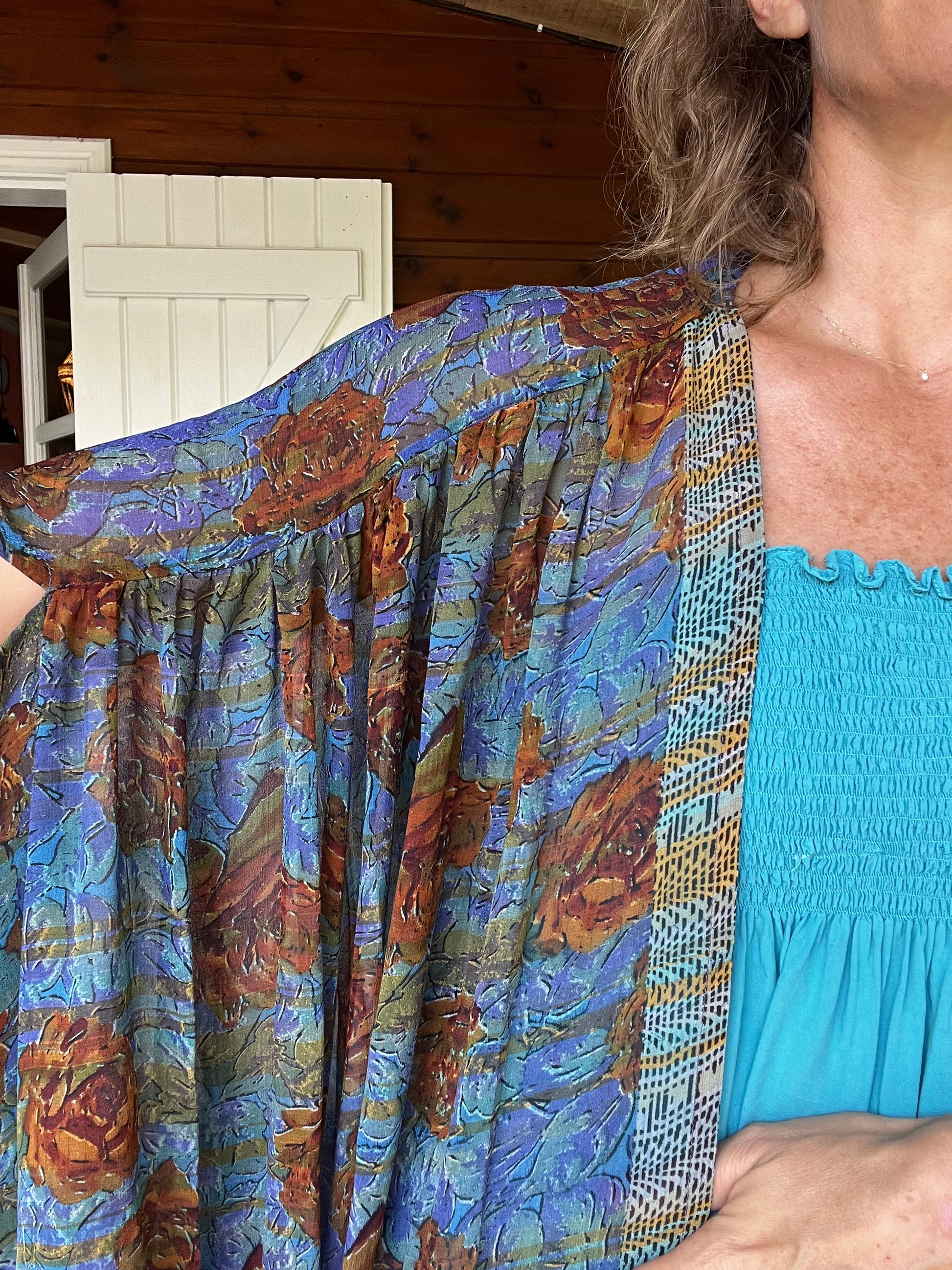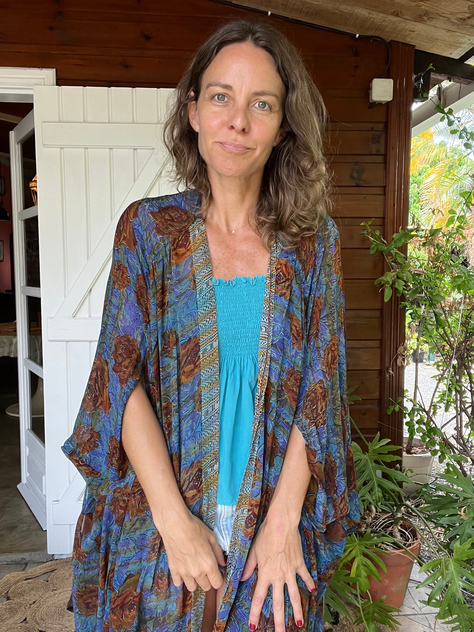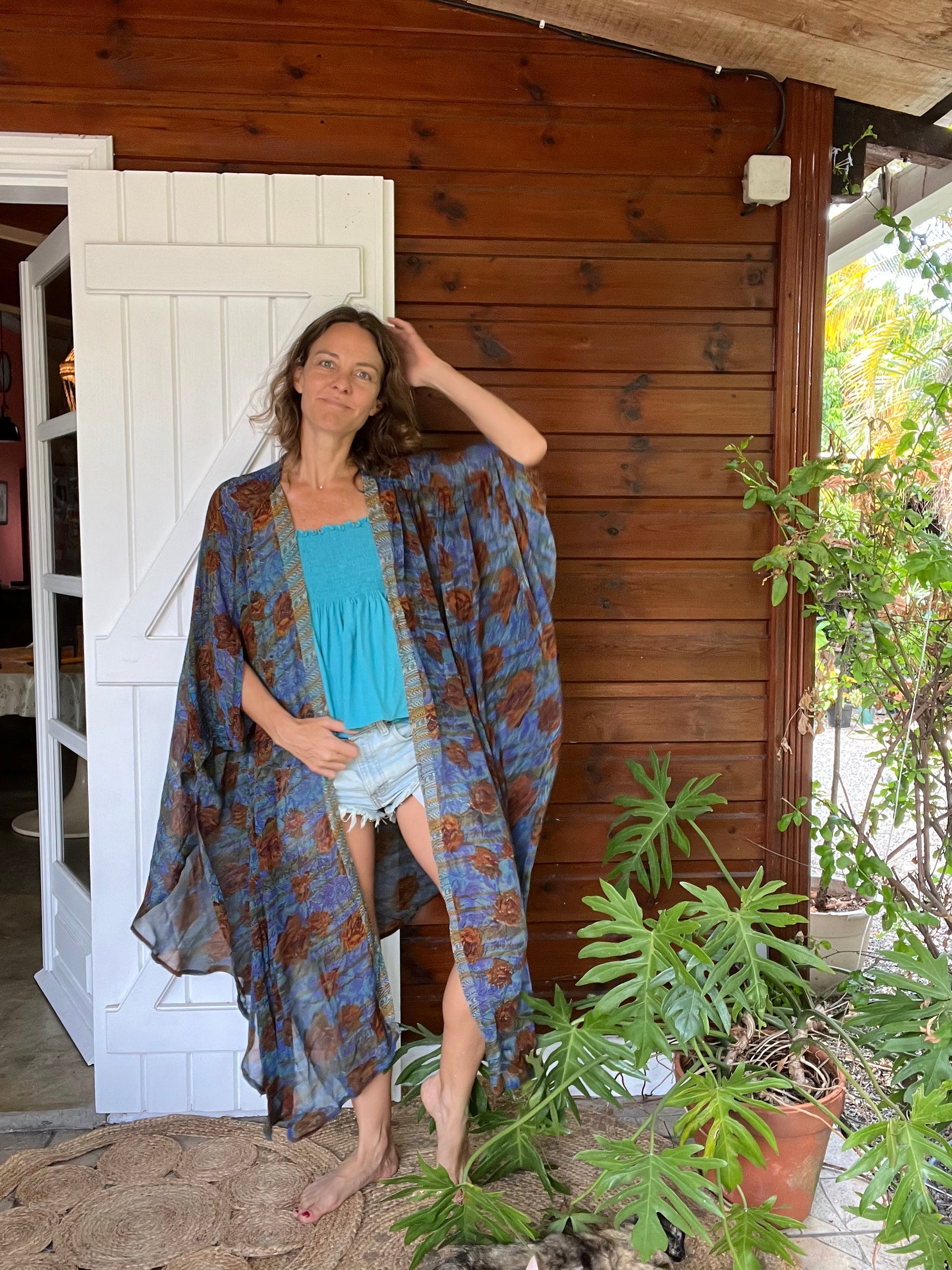 Le Kimono Meekha, une pièce bohème chic qui incarne l'élégance et le décontracté. Notre best seller est disponible en différents coloris et motifs à retrouver sur notre site. Cette pièce est unique et est fabriquée à partir d'un sari ancien en soie naturelle.