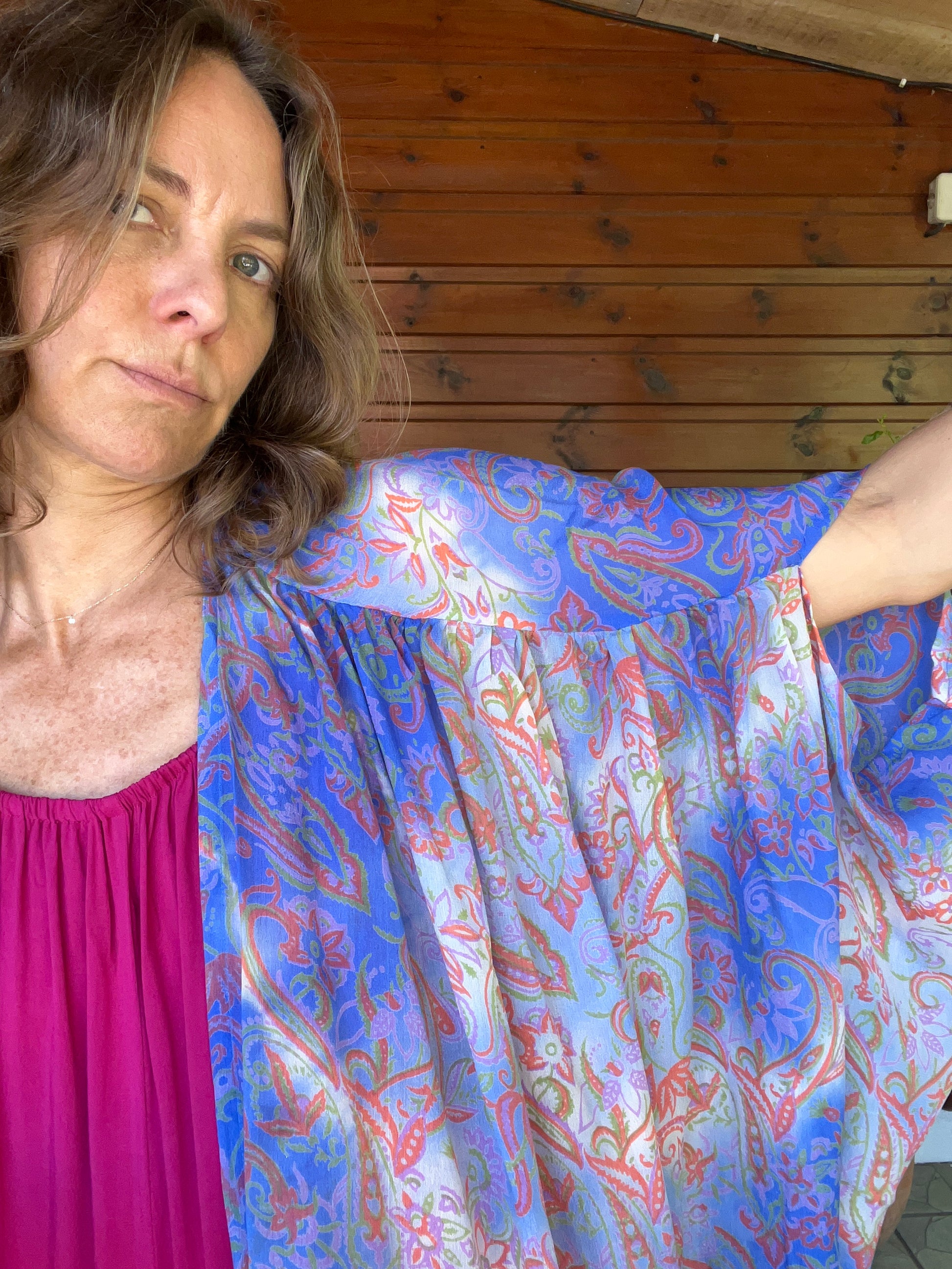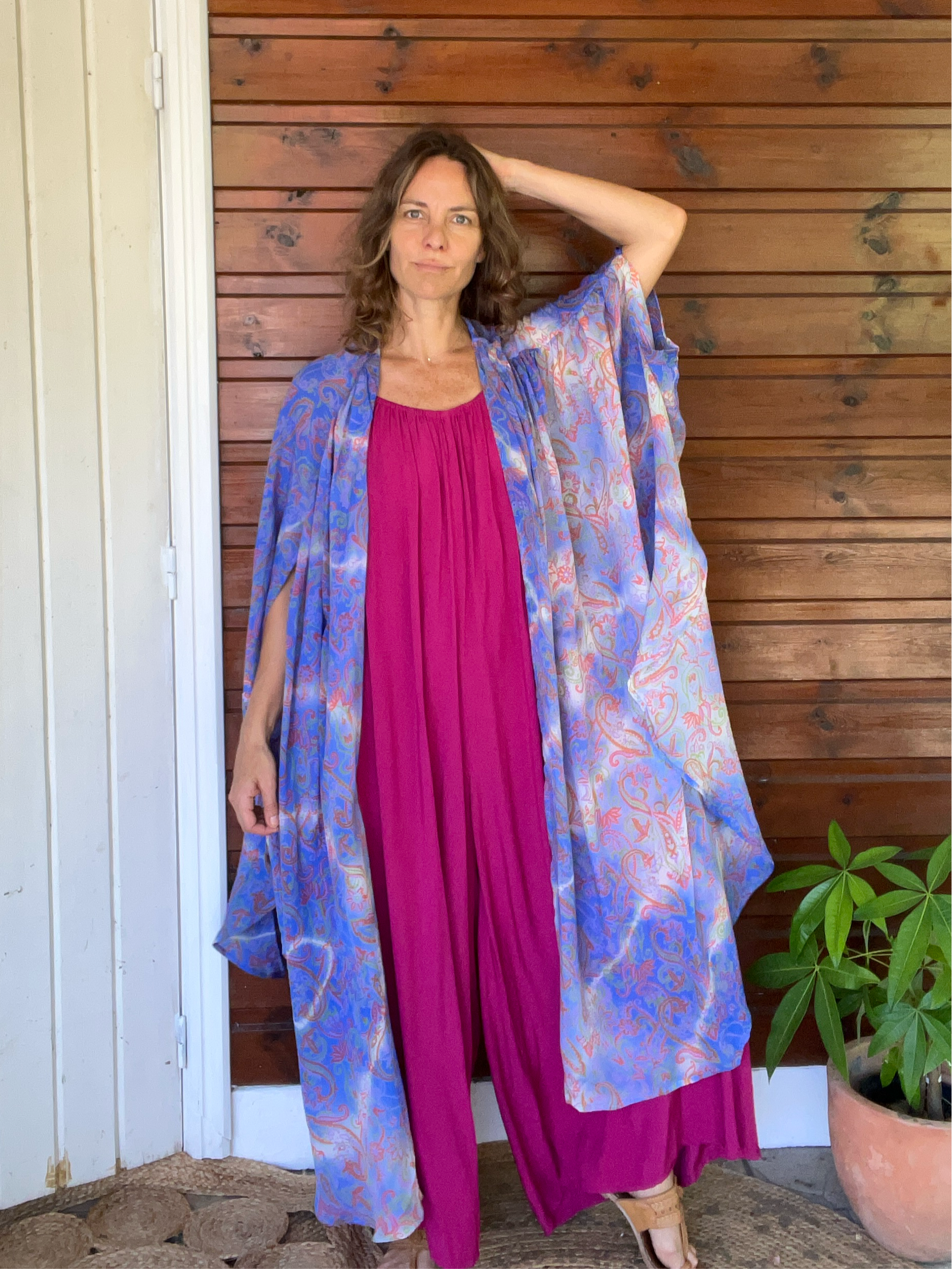 Le Kimono Meekha, une pièce bohème chic qui incarne l'élégance et le décontracté. Notre best seller est disponible en différents coloris et motifs à retrouver sur notre site. Cette pièce est unique et est fabriquée à partir d'un sari ancien en soie naturelle.