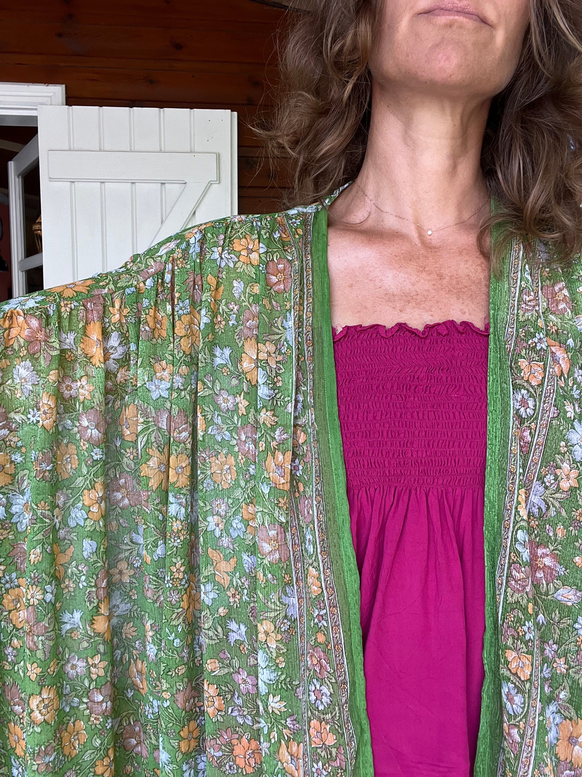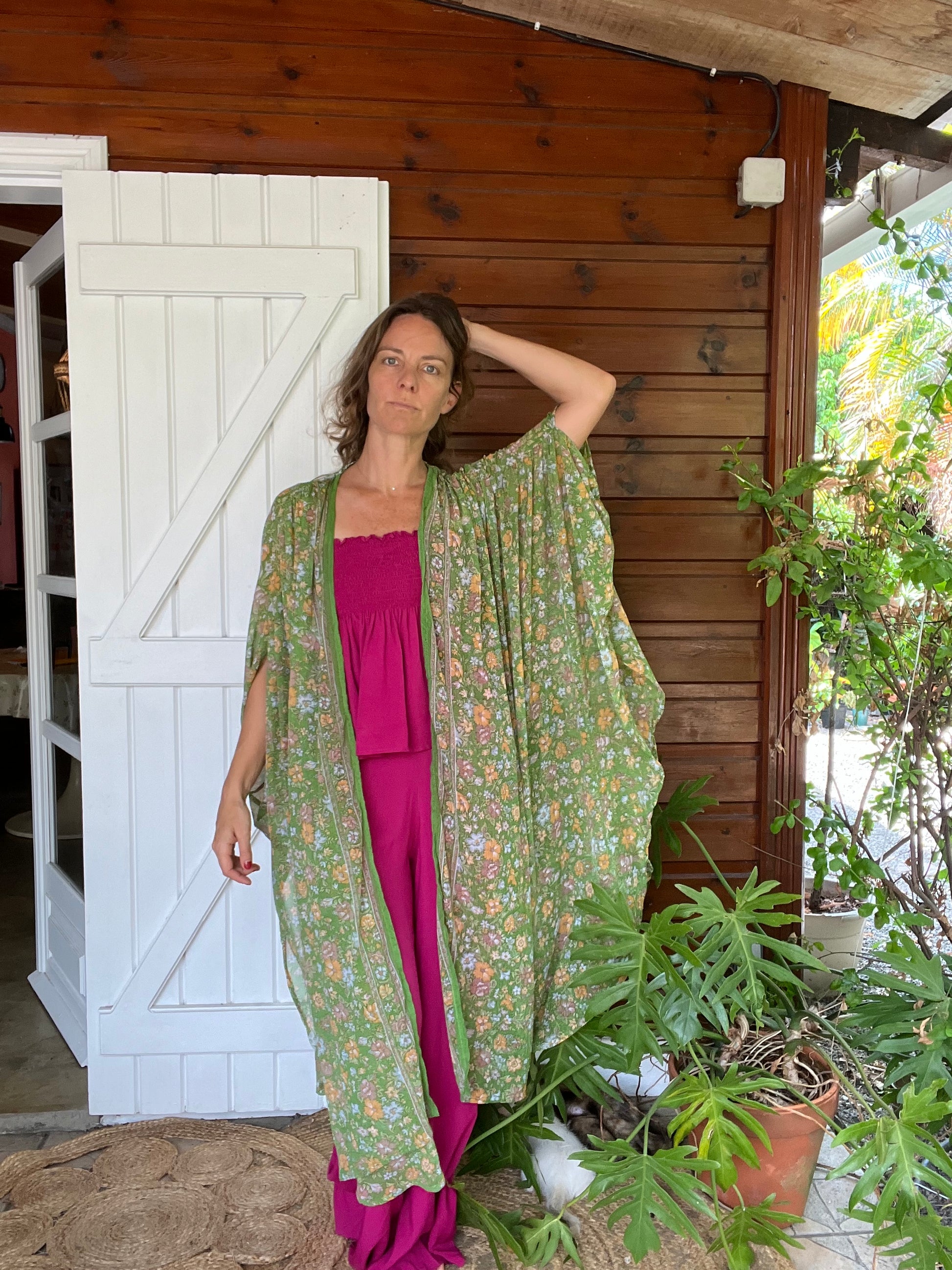 Le Kimono Meekha, une pièce bohème chic qui incarne l'élégance et le décontracté. Notre best seller est disponible en différents coloris et motifs à retrouver sur notre site. Cette pièce est unique et est fabriquée à partir d'un sari ancien en soie naturelle.