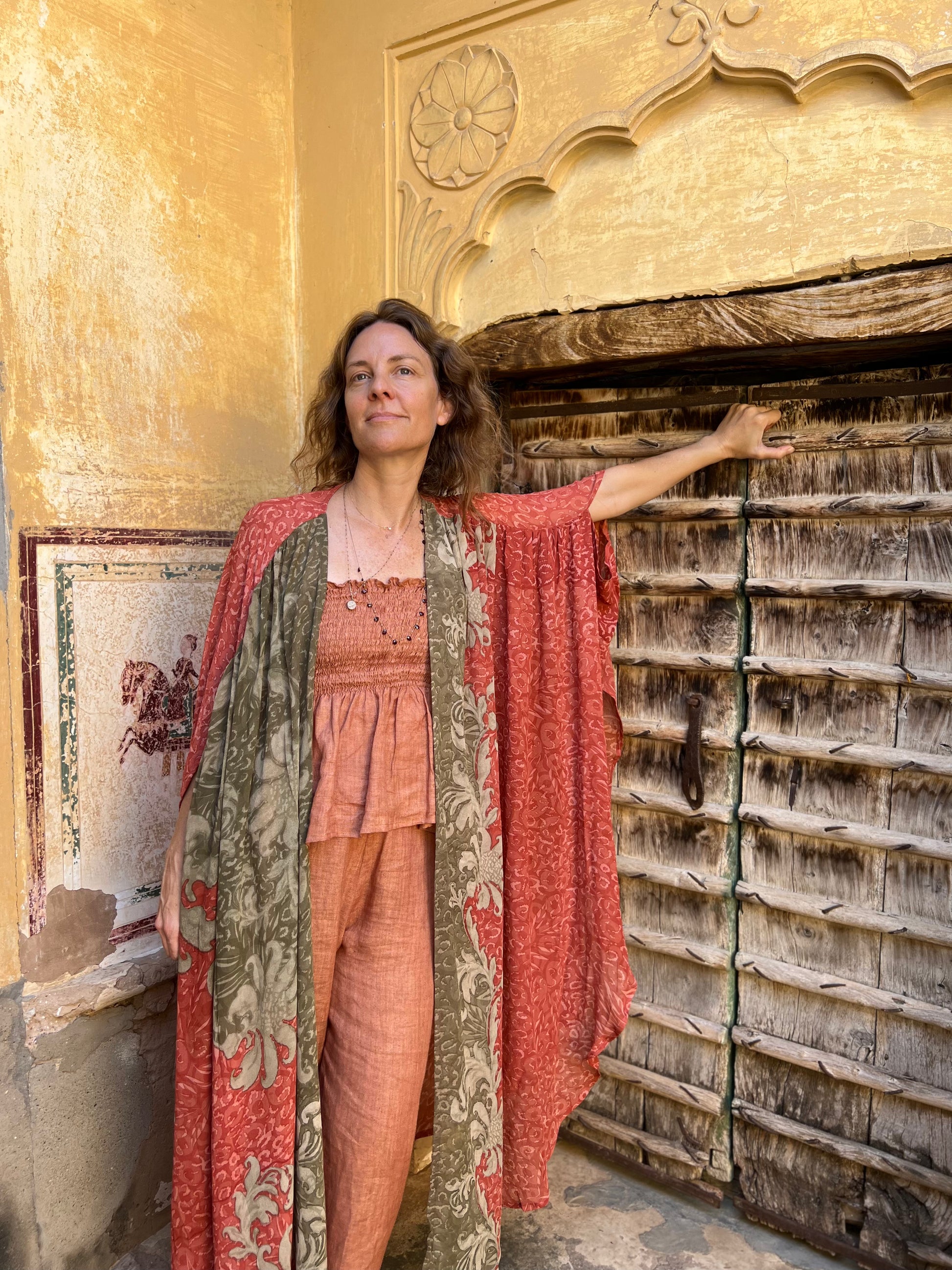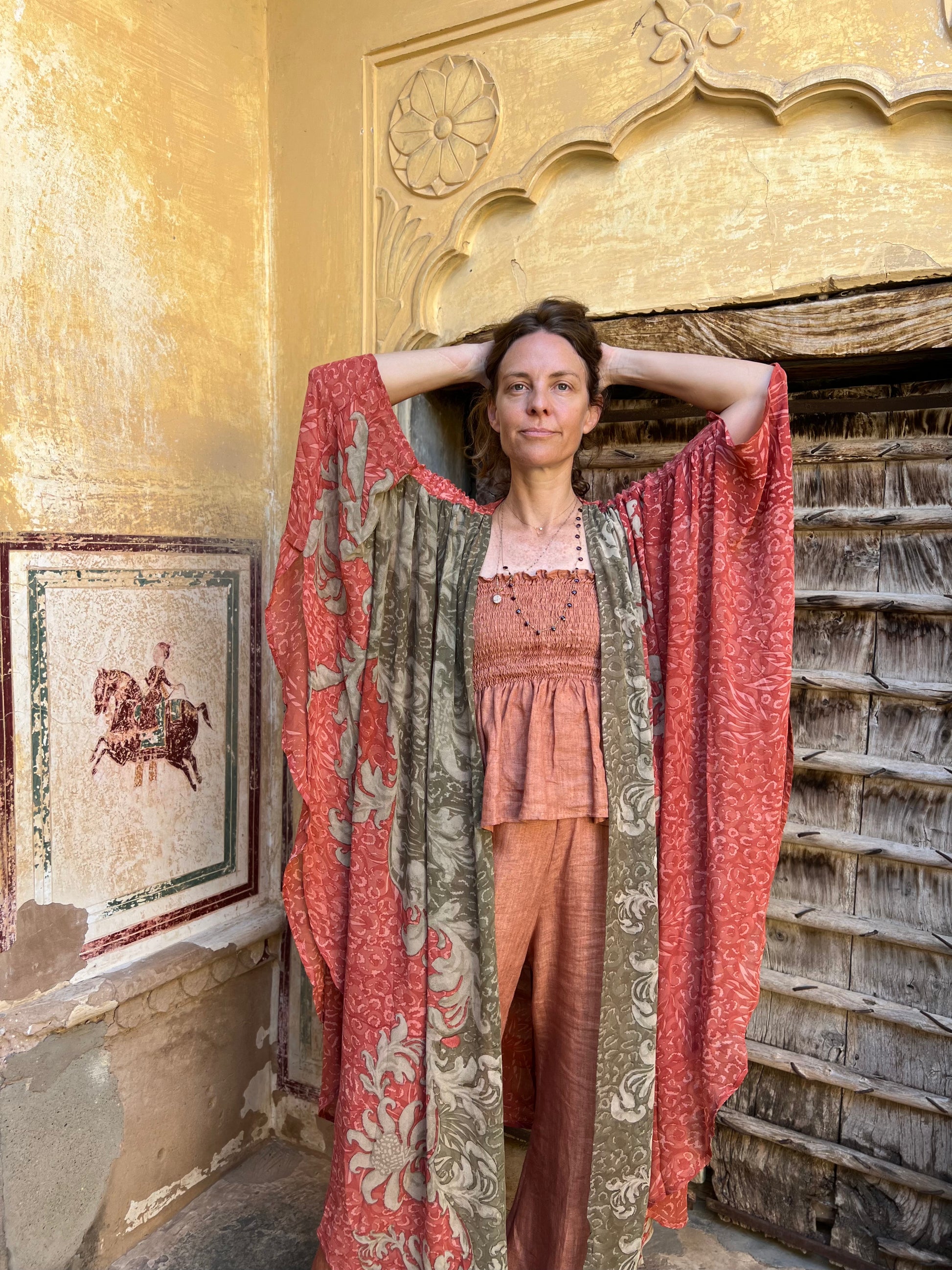 Le Kimono Meekha, une pièce bohème chic qui incarne l'élégance et le décontracté. Disponible en différents coloris et motifs à retrouver sur notre site. Cette pièce est unique et est fabriquée à partir d'un sari ancien en soie naturelle.