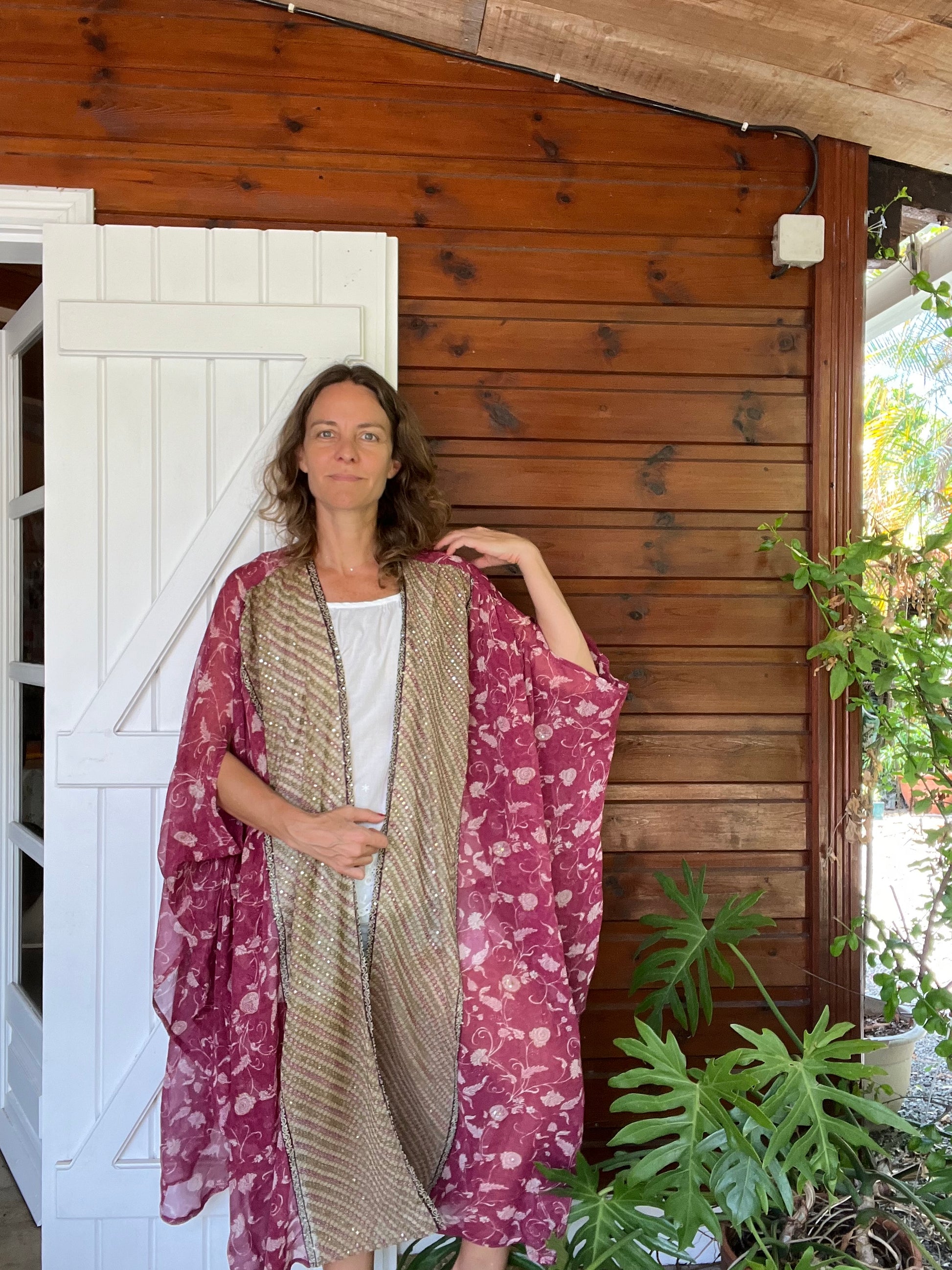 Le Kimono Meekha, une pièce bohème chic qui incarne l'élégance et le décontracté. Notre best seller est disponible en différents coloris et motifs à retrouver sur notre site. Cette pièce est unique et est fabriquée à partir d'un sari ancien en soie naturelle.