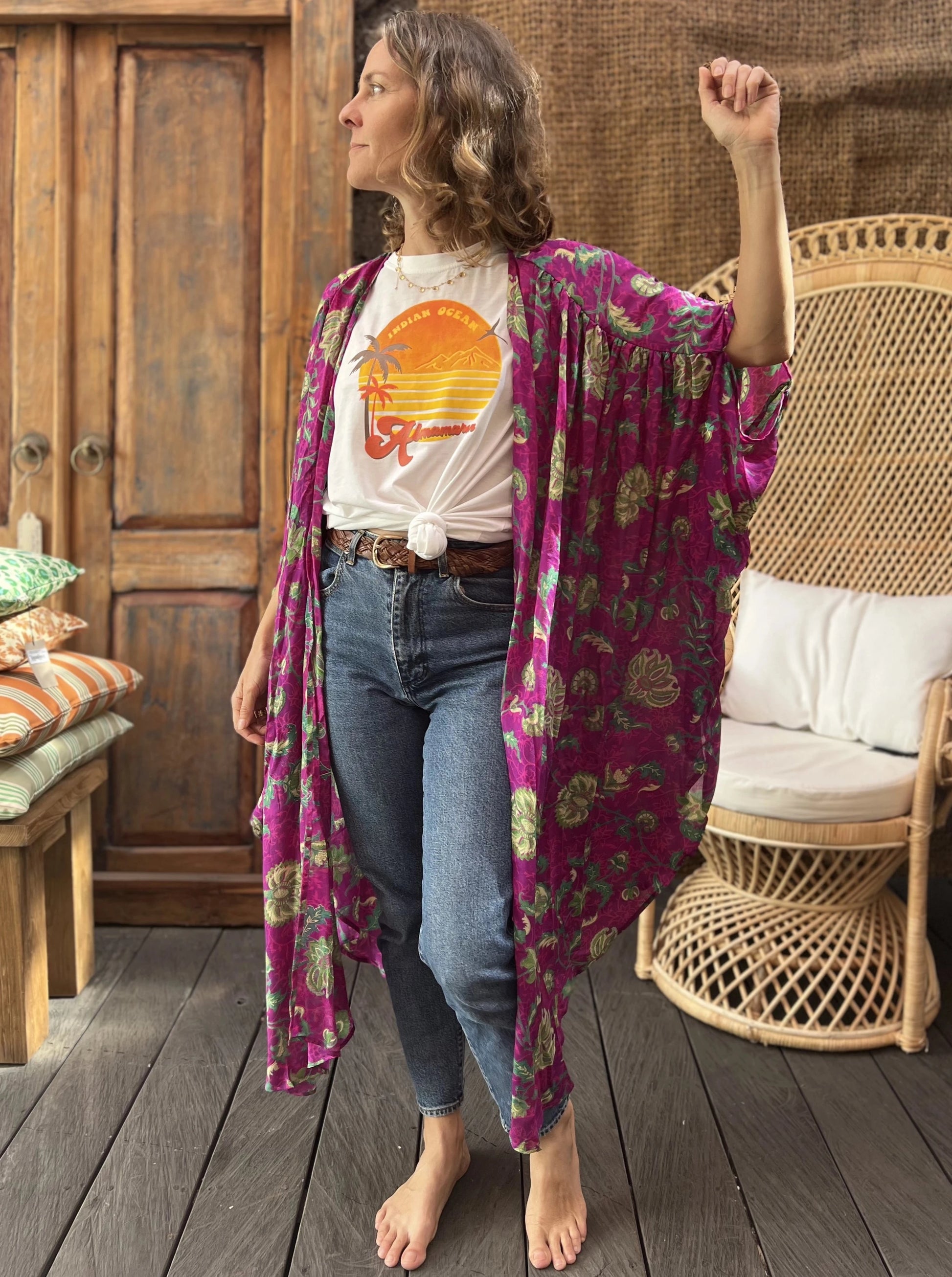 Le Kimono Meekha, une pièce bohème chic qui incarne l'élégance et le décontracté. Notre best seller est disponible en différents coloris et motifs à retrouver sur notre site. Cette pièce est unique et est fabriquée à partir d'un sari ancien en soie naturelle.