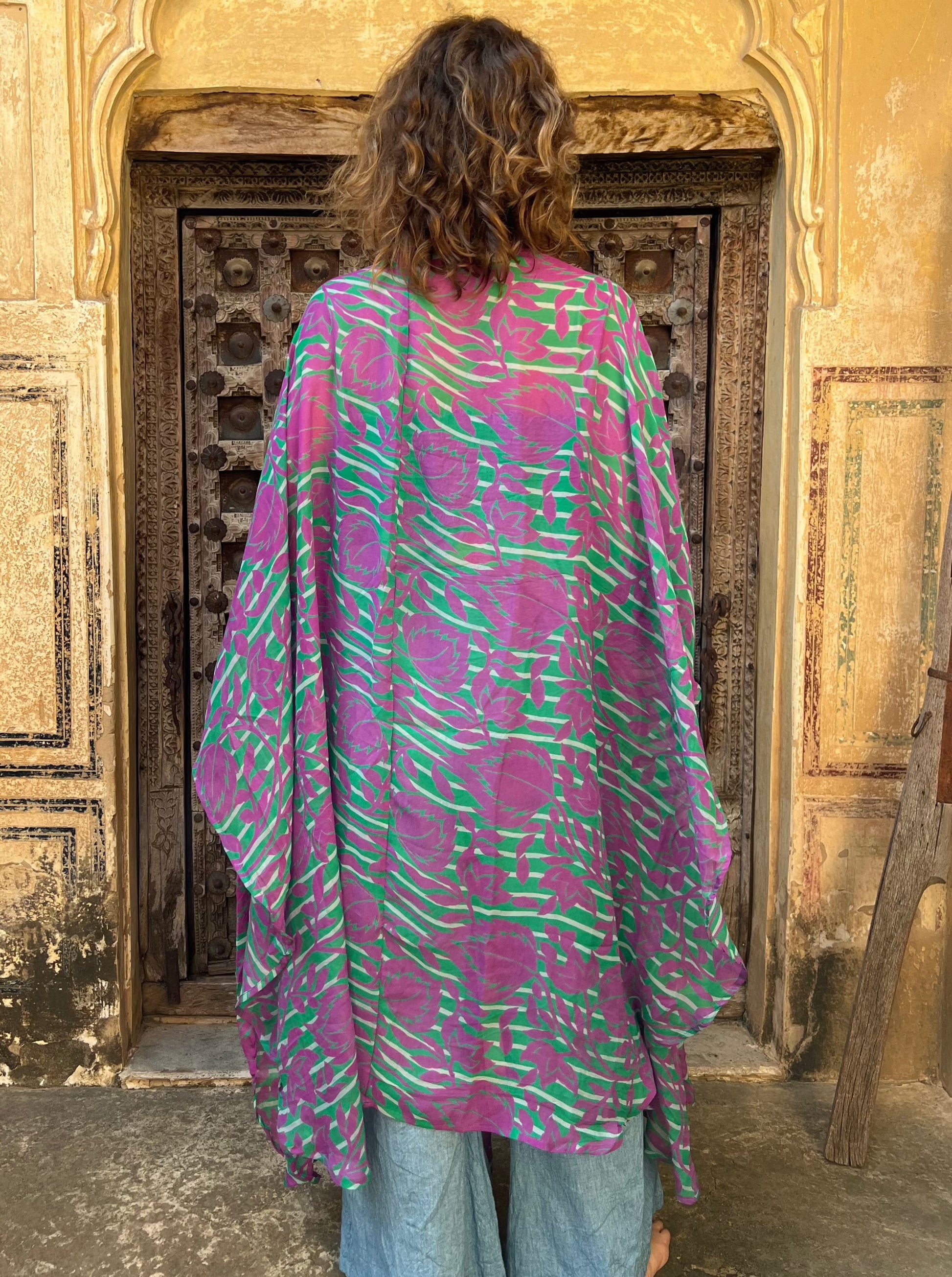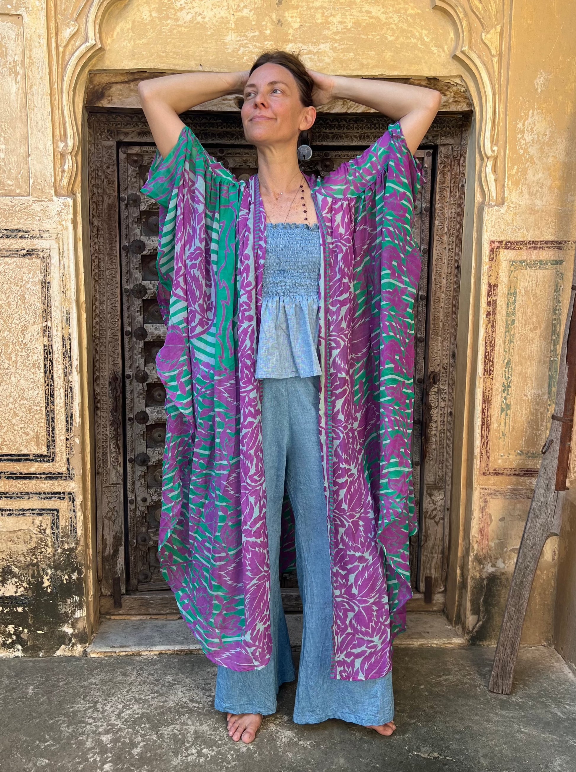 Le Kimono Meekha, une pièce bohème chic qui incarne l'élégance et le décontracté. Disponible en différents coloris et motifs à retrouver sur notre site. Cette pièce est unique et est fabriquée à partir d'un sari ancien en soie naturelle.