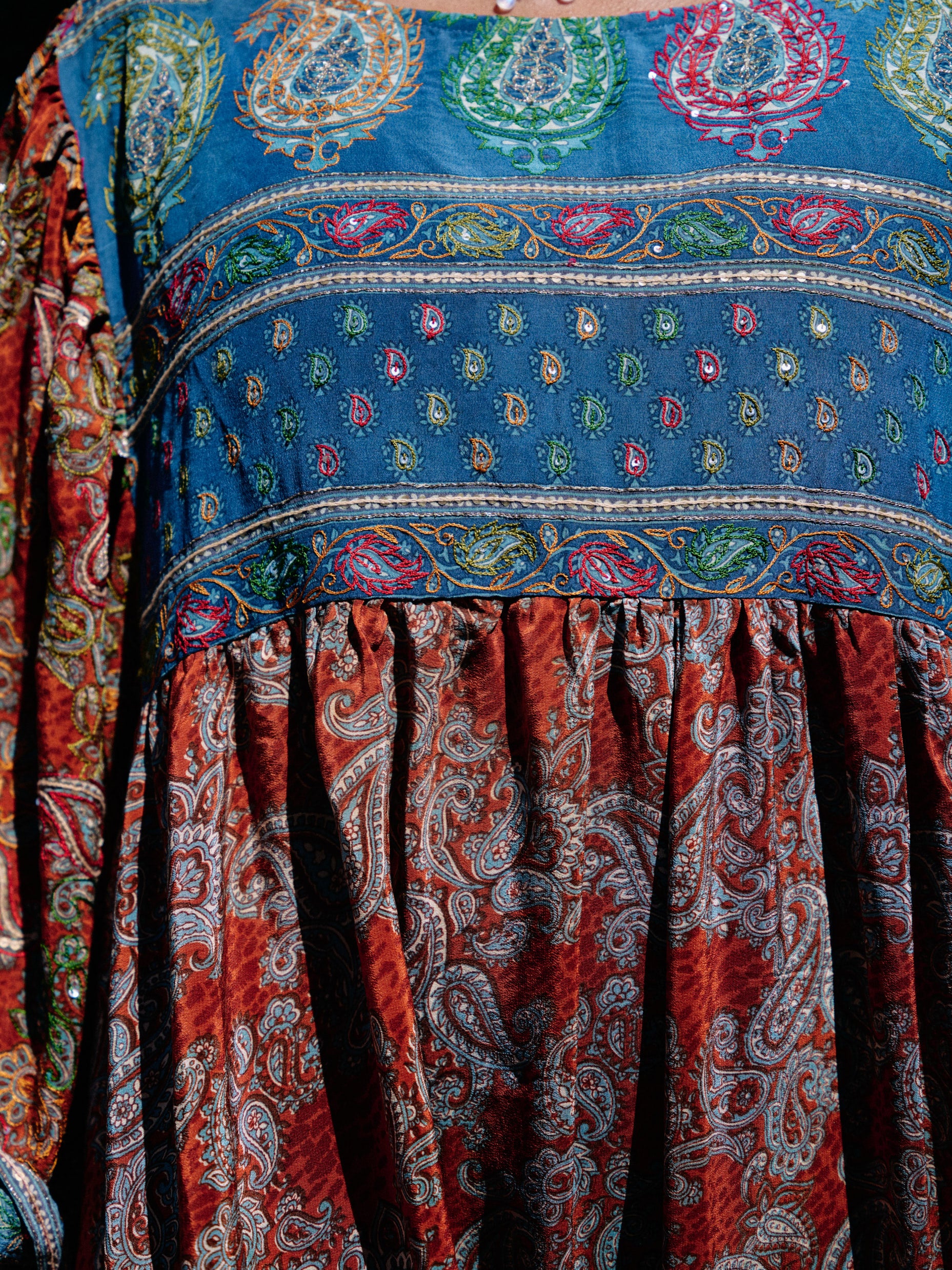 Notre Robe Akansha a un style bohème. Elle a été conçue à partir d'un sari ancien en crèpe de soie naturelle. Cette pièce unique offre une silhouette longue et fluide.