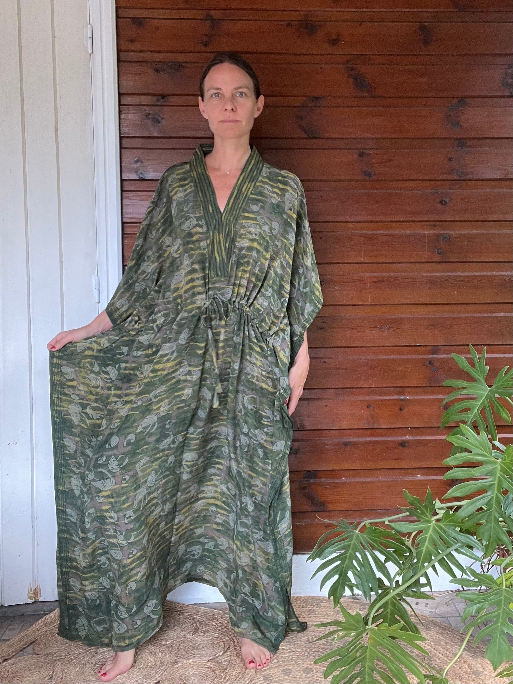 Robe réalisée à partir d'un ancien sari en crèpe de soie imprimée.