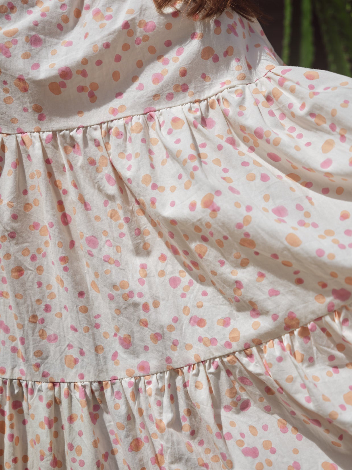 Robe Denise version longue. Des bretelles nouables qui permettent d'ajuster la robe et d'approfondir les décolletés comme on le souhaite. Ici avec un motif orignal créé pour la collection: un pois revisité.