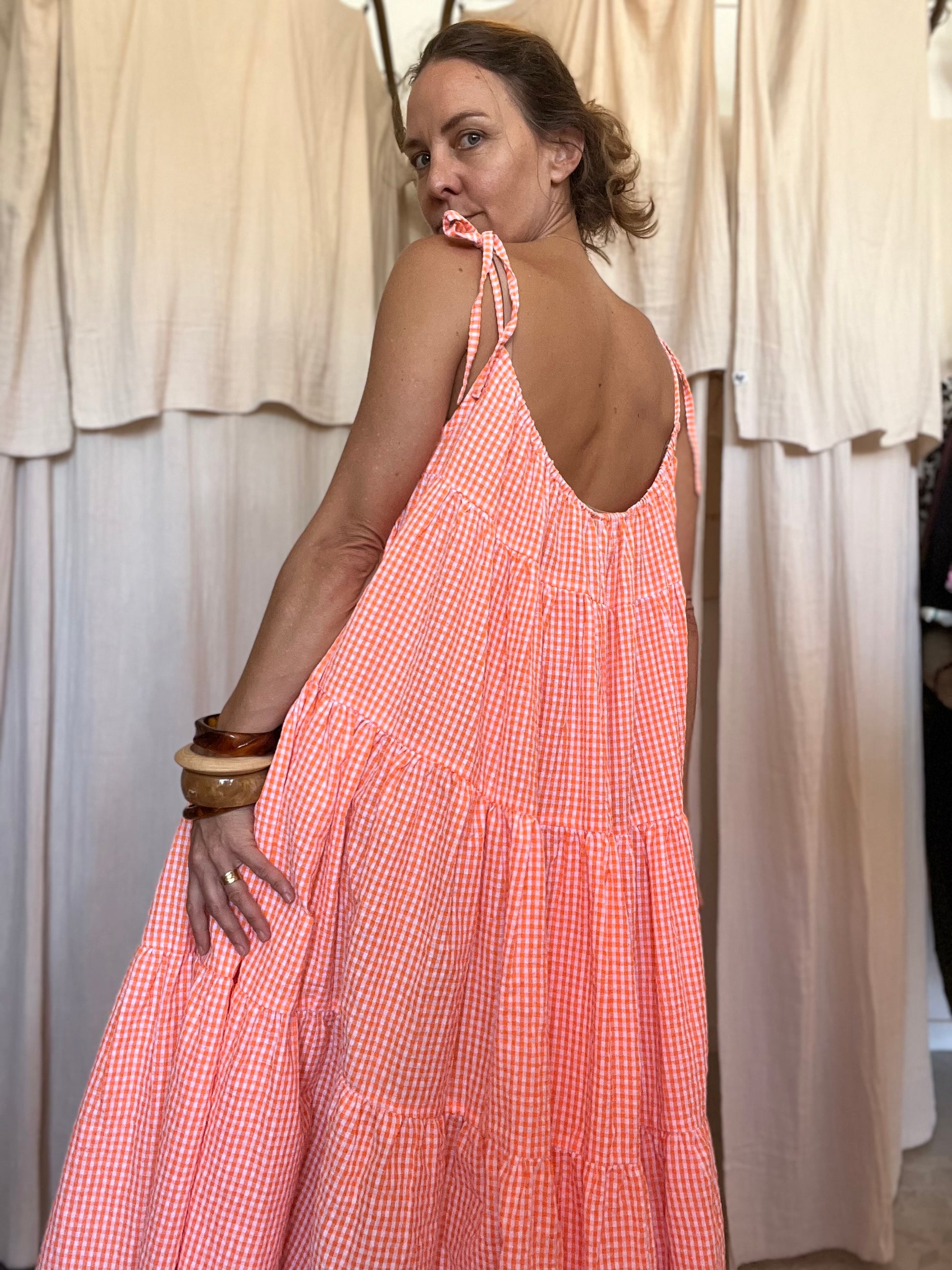 Robe Denise version longue. Des bretelles nouables qui permettent d'ajuster la robe et d'approfondir les décolletés comme on le souhaite.