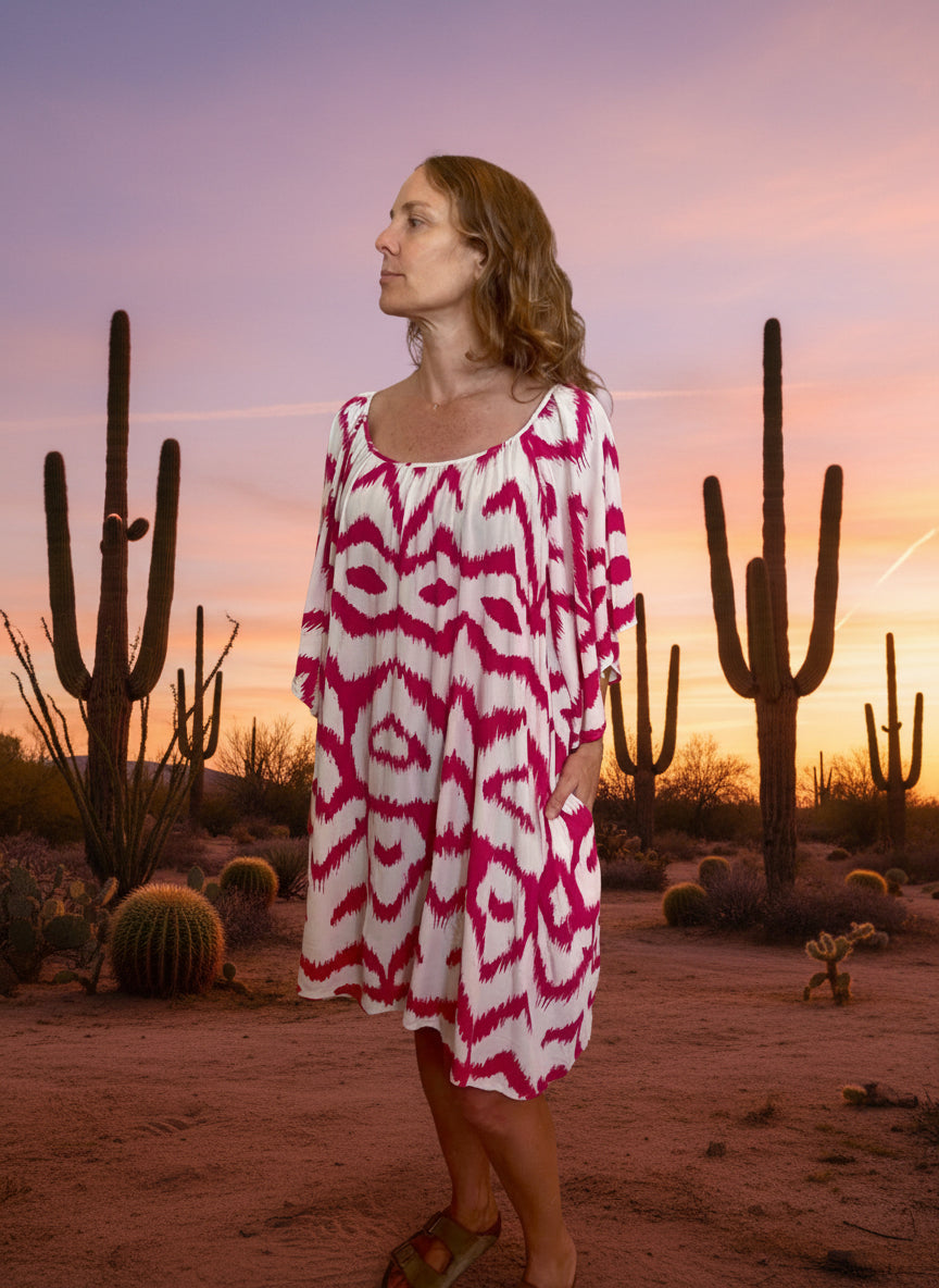 La Robe Playa a une coupe bohème. Elle possède de grandes manches amples lui donnant une allure légère. très jolie encolure arrondie devant et dos.