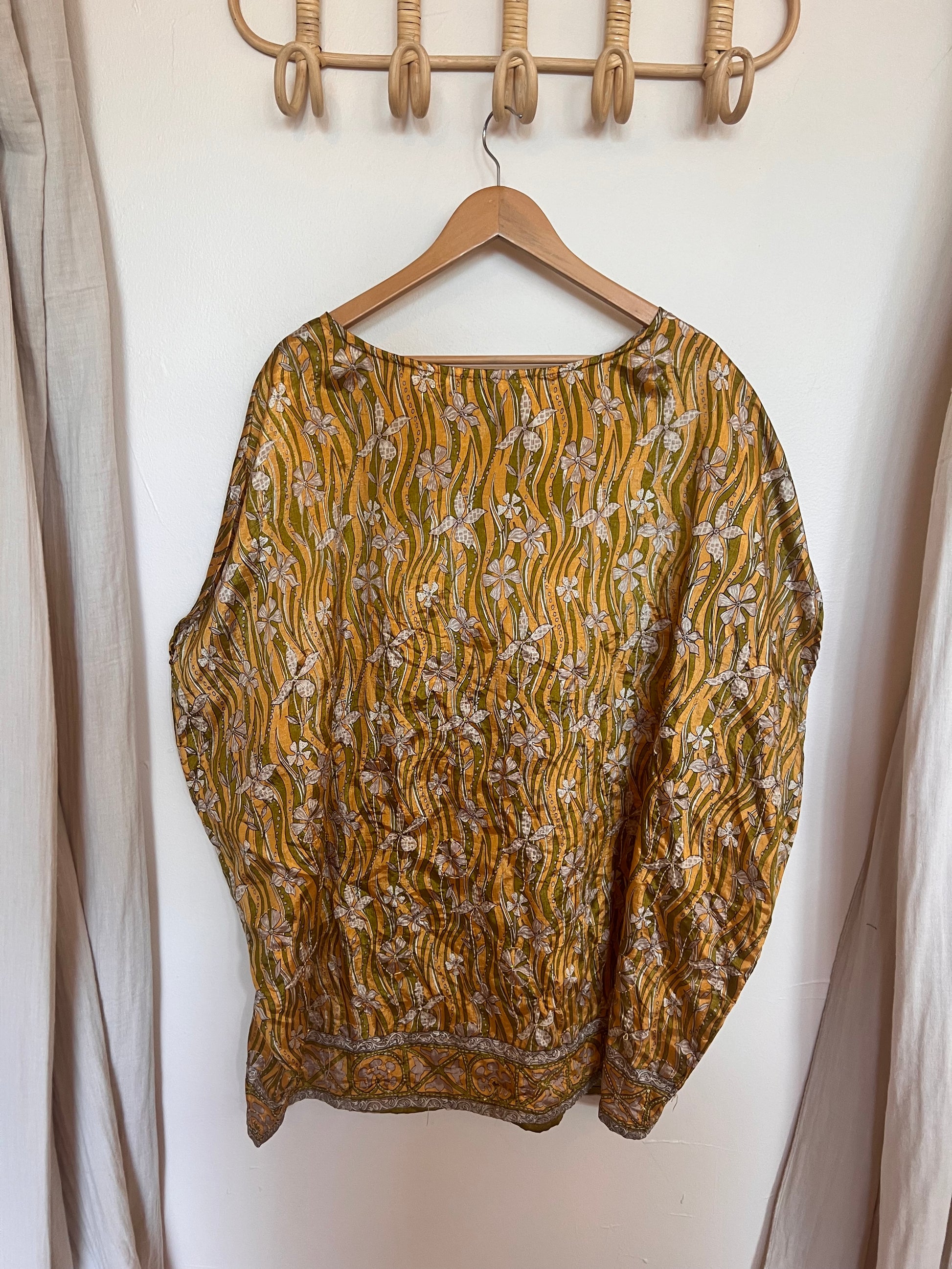 Robe en soie 100% naturelle issue d’un sari ancien. Coupe ronde avec manches intégrées. Broderie main.