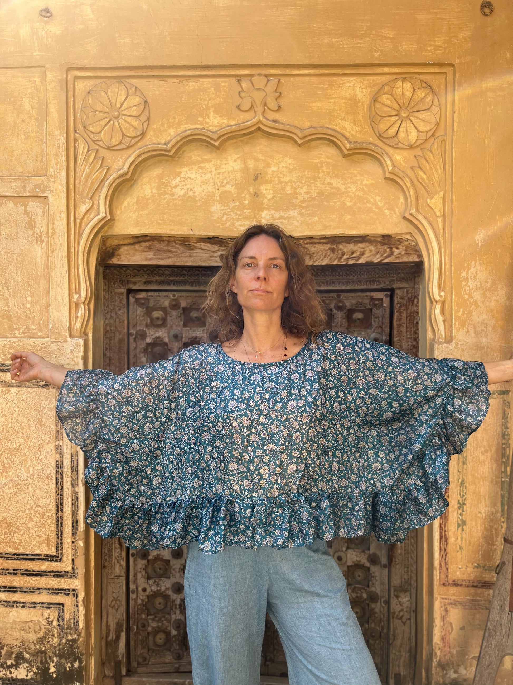 Top à la coupe bohème avec volant sur tout le tour. Taille unique. Convient de la taille XS à la taille L. Pièce unique réalisée à partir d'un sari ancien en soie naturelle.