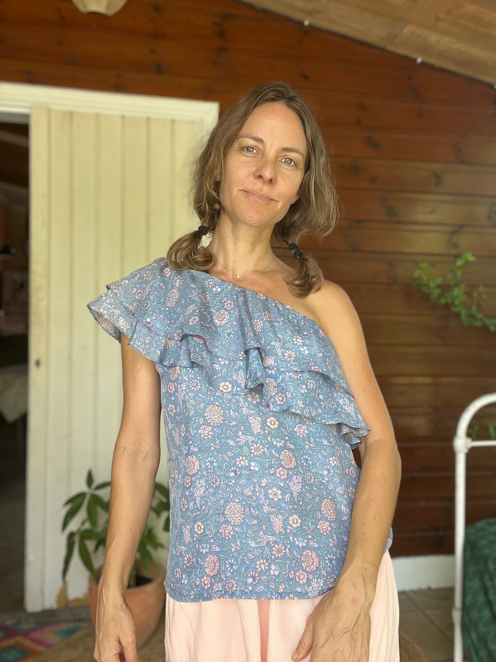 Top à la coupe bohème one shoulder avec des volants sur tout le tour. Élastique pour ajuster. Taille unique. Convient de la taille XS à la taille L. Pièce unique réalisée à partir d'un sari ancien en soie naturelle.