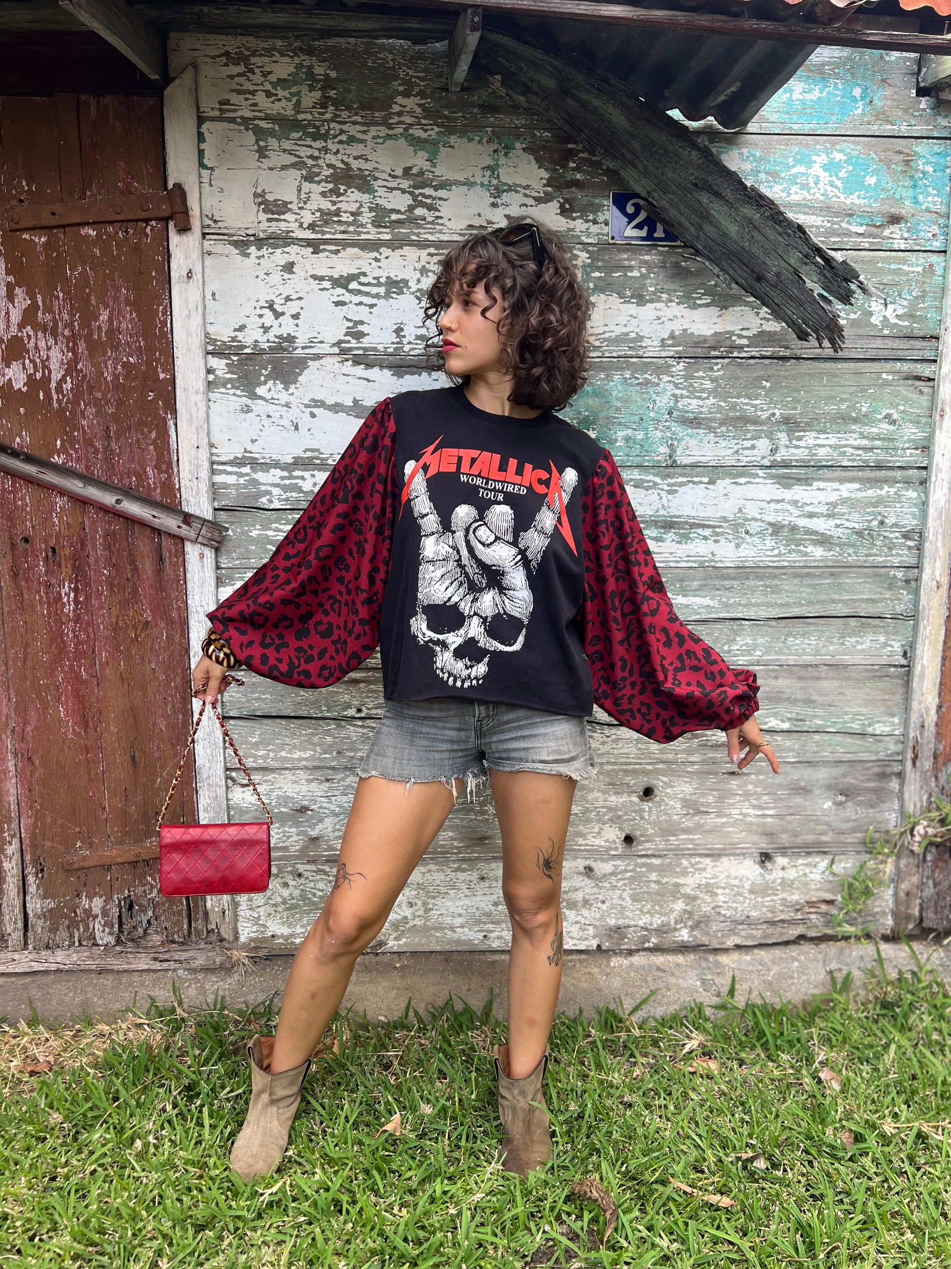 - manches bouffantes viscose panthère rouge et élastique aux poignets