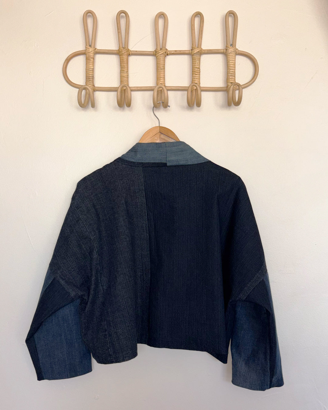 Notre Veste Takamaka est réversible. Elle dispose d'un coté en denim confectionné à partir de jeans recyclés, tandis que de l'autre côté elle arbore un tissu imprimé à la main à la technique du blockprint.